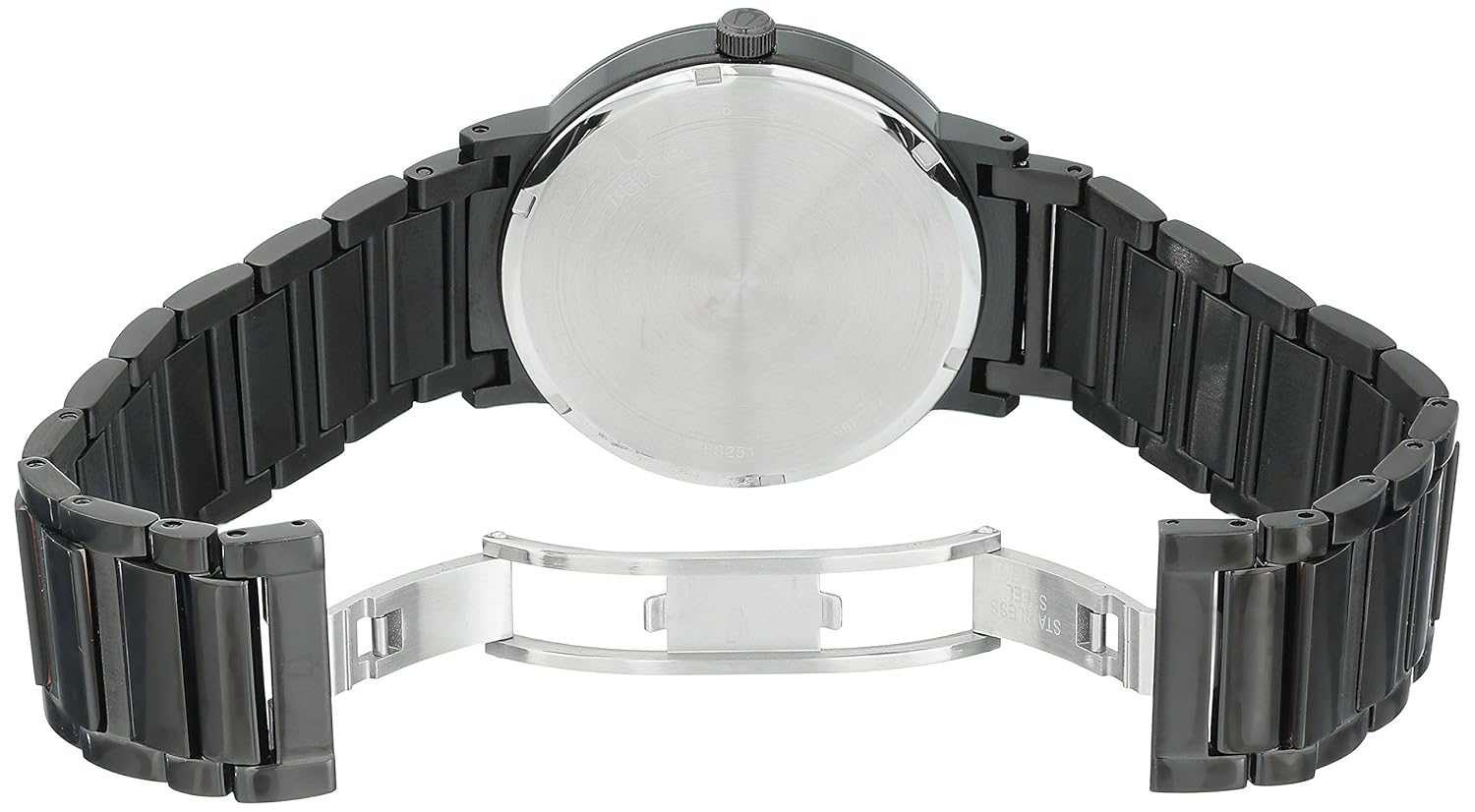 - Three-hand date feature, metalized edge-to-edge curved crystal, screw-back case, black ip stainless steel bracelet with deployant closure, and water resistance to 30 meters
