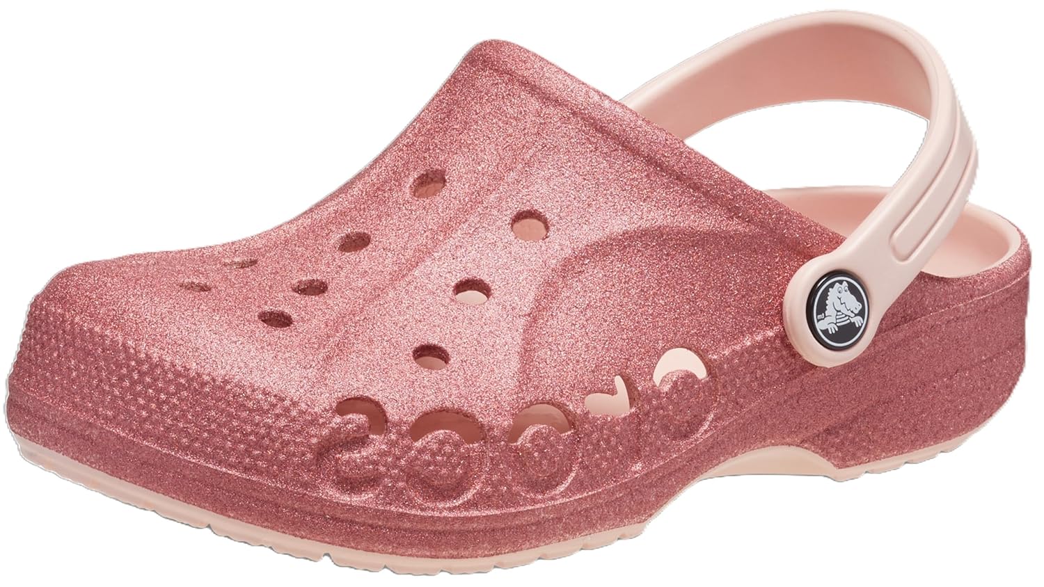They have pink glitter, and although I’m not a fan of the pink (advertised as a hot pink), they’re still cute. They’re topped with a fine glitter which projects the perfect amount of sparkle. I added the jibbitz. Can’t go wrong really, I bought them as a shoe my 2 year old could wear around the house that I could clean easily and their waterproof which is convenient. If warmth is a worry then it could be worn with socks, just buy with enough room. I recommend this product.