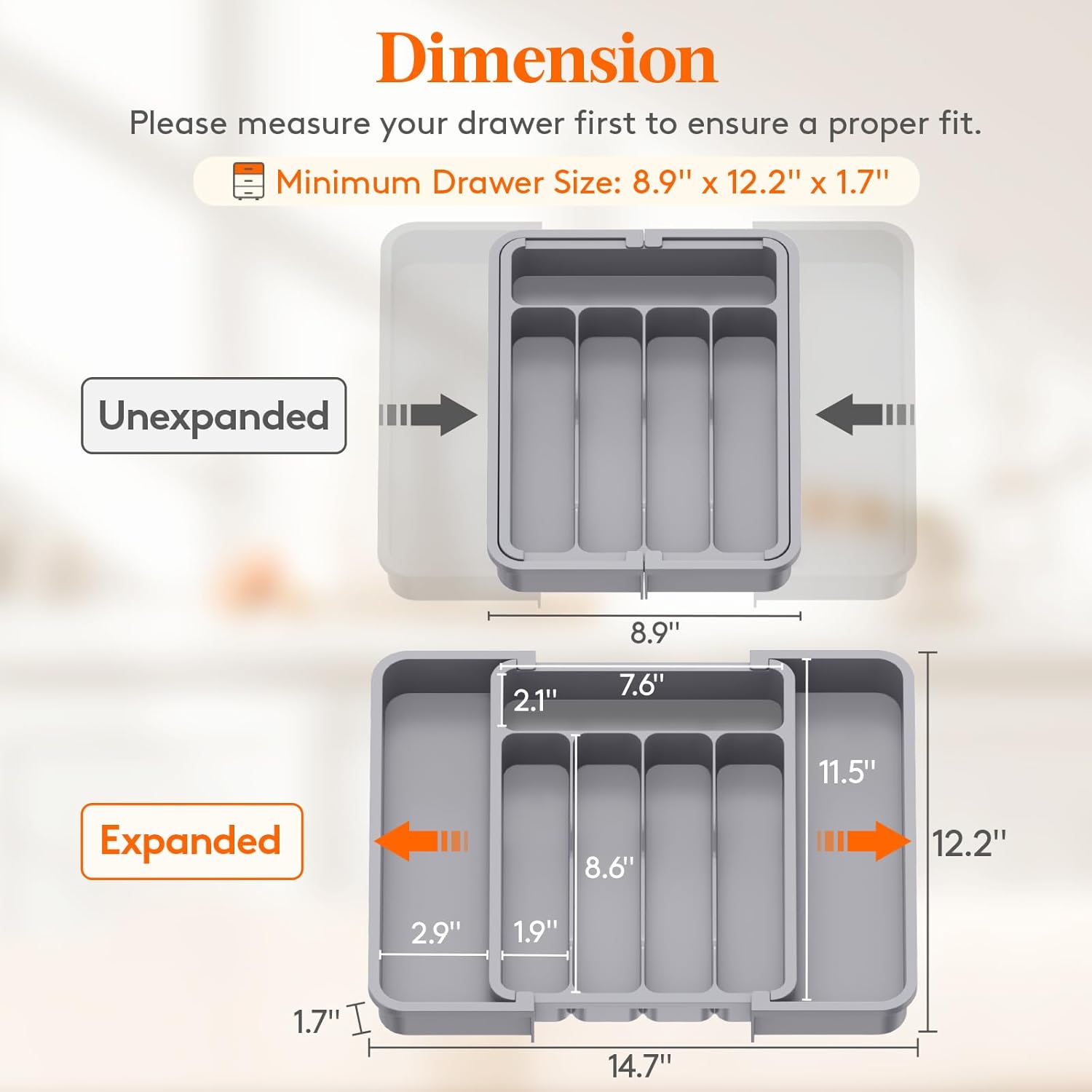 - Adjustable Size: With an adjustable width between 8.5-14.1 inches, it is compatible with different drawer sizes. When fully expanded, the cutlery box dimensions are 14.1 x 12.1 x 1.5 inches and when fully folded, it reduces to 8.5 x 12.1 x 1.5 inches. So no matter what size your kitchen drawers are, this utensil organizer will surely fit in