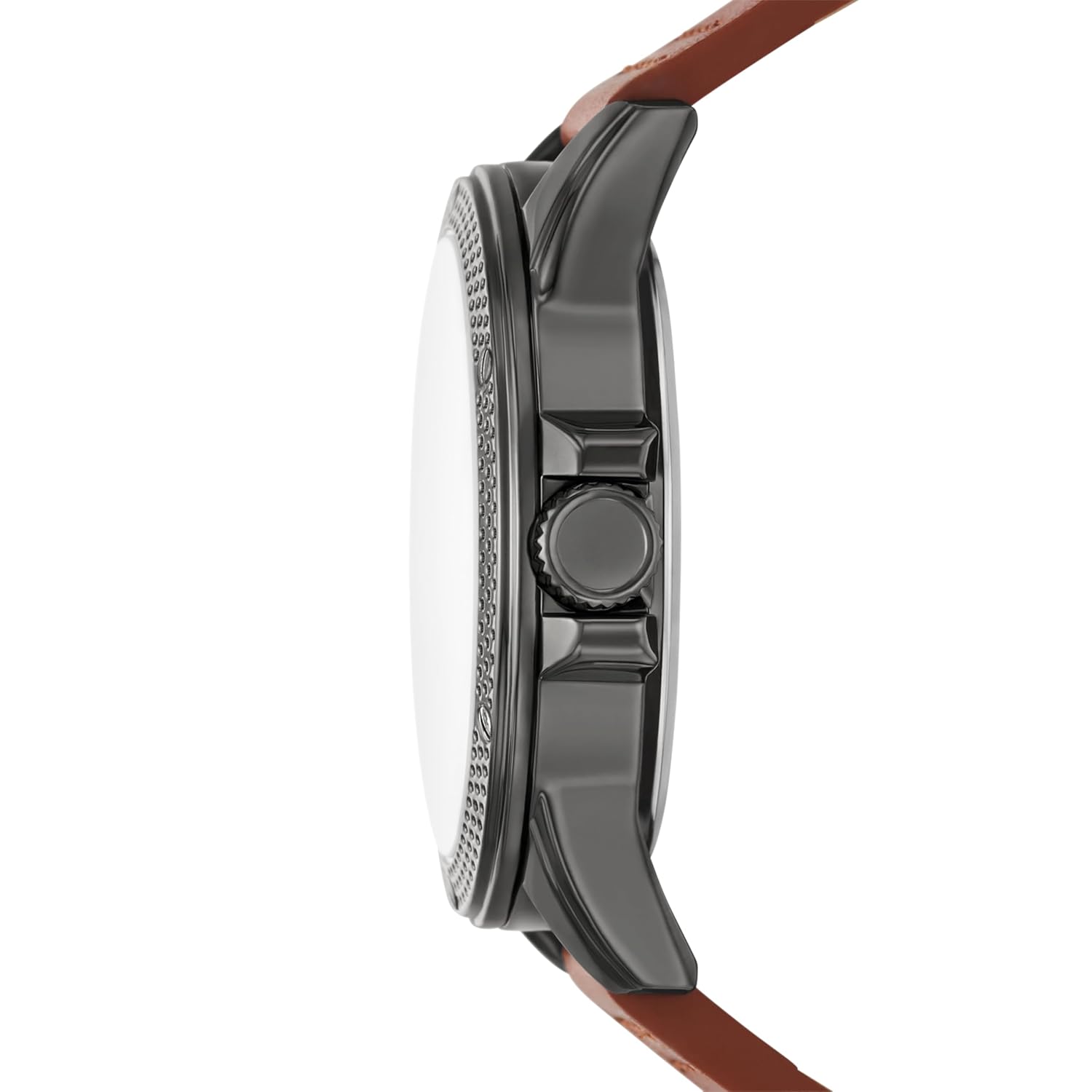 - This Relic gunmetal watch commands attention with a brushed case and brown leather strap. Crafted for adventures, it balances functionality with an undeniable edge—water resistance, quartz movement with date window, and hardened mineral crystal face.