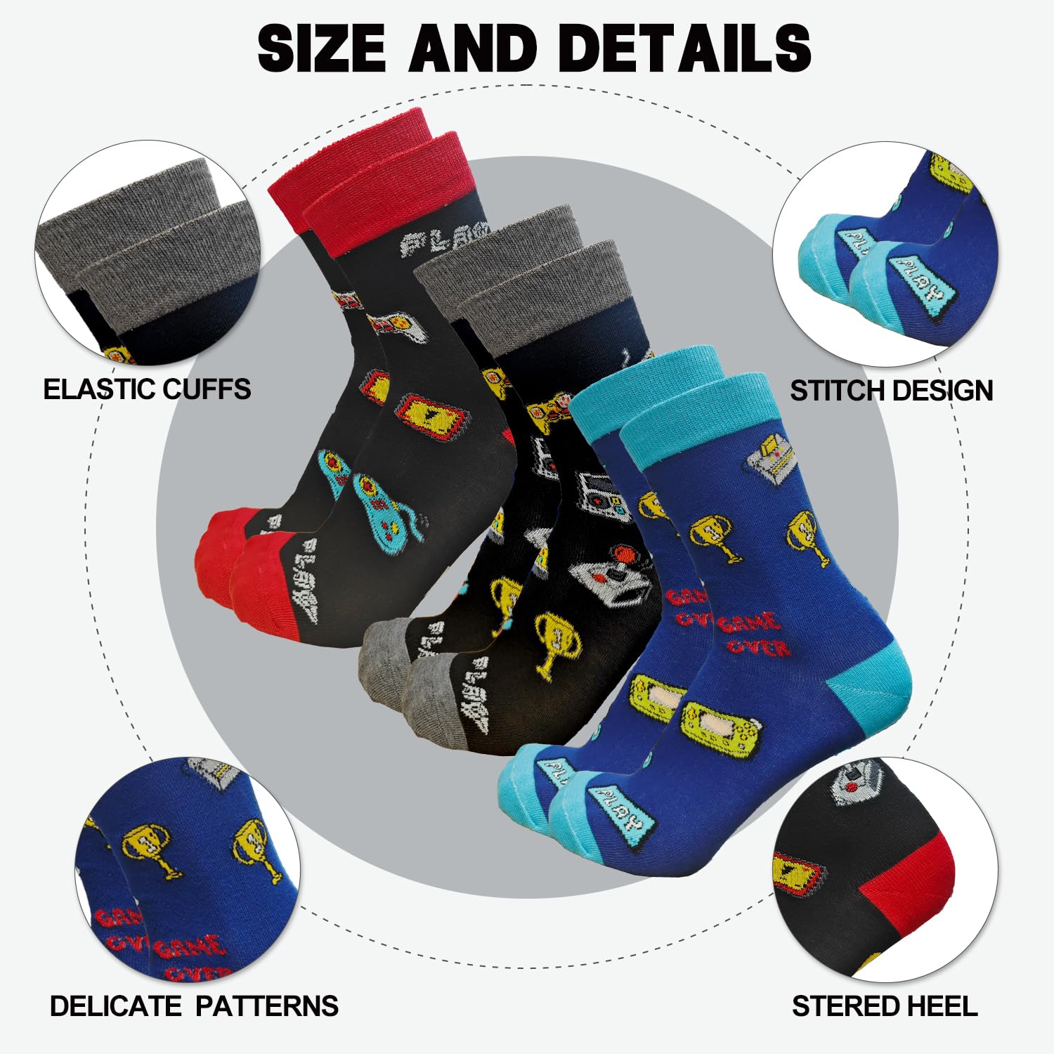 3 Pack Novelty Gamer Socks Gifts for Teenage Men, Funny Cotton Gaming Stuff Socks Birthday Gifts Size 7-12