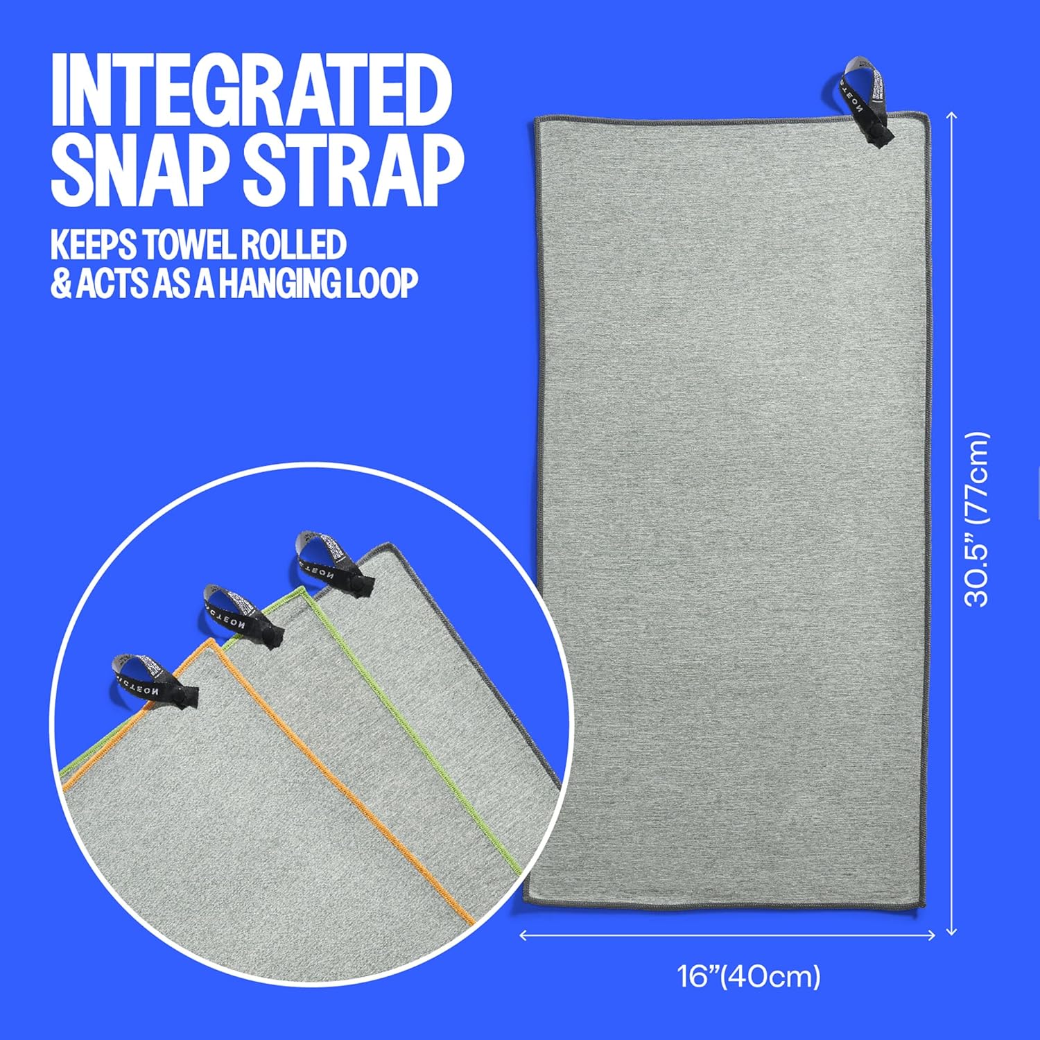 - ULTRA COMPACT, LIGHTWEIGHT, STAY CLEAN WITH HANGING LOOP: With an integrated snap strap closure that doubles as a hanging loop over the door, your backpack, or bottle. the large thin towel rolls up into a packable travel-friendly size. Perfect for anyone who travels light.