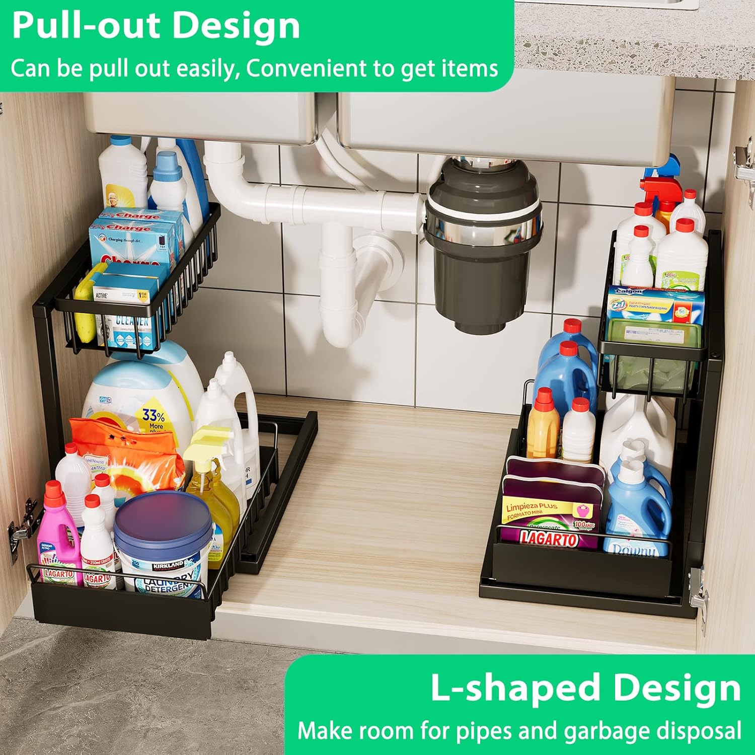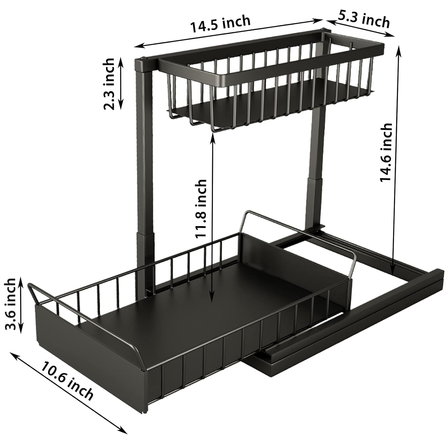 - 【L-shaped Design】: The 2 tier sliding under the sink organizer is designed to be L-shaped, features a narrow top basket and one slide-out wide storage drawer which makes it easier to find things in a tight space and add more storage space to your bathroom kitchen under sink, countertop or the pantry