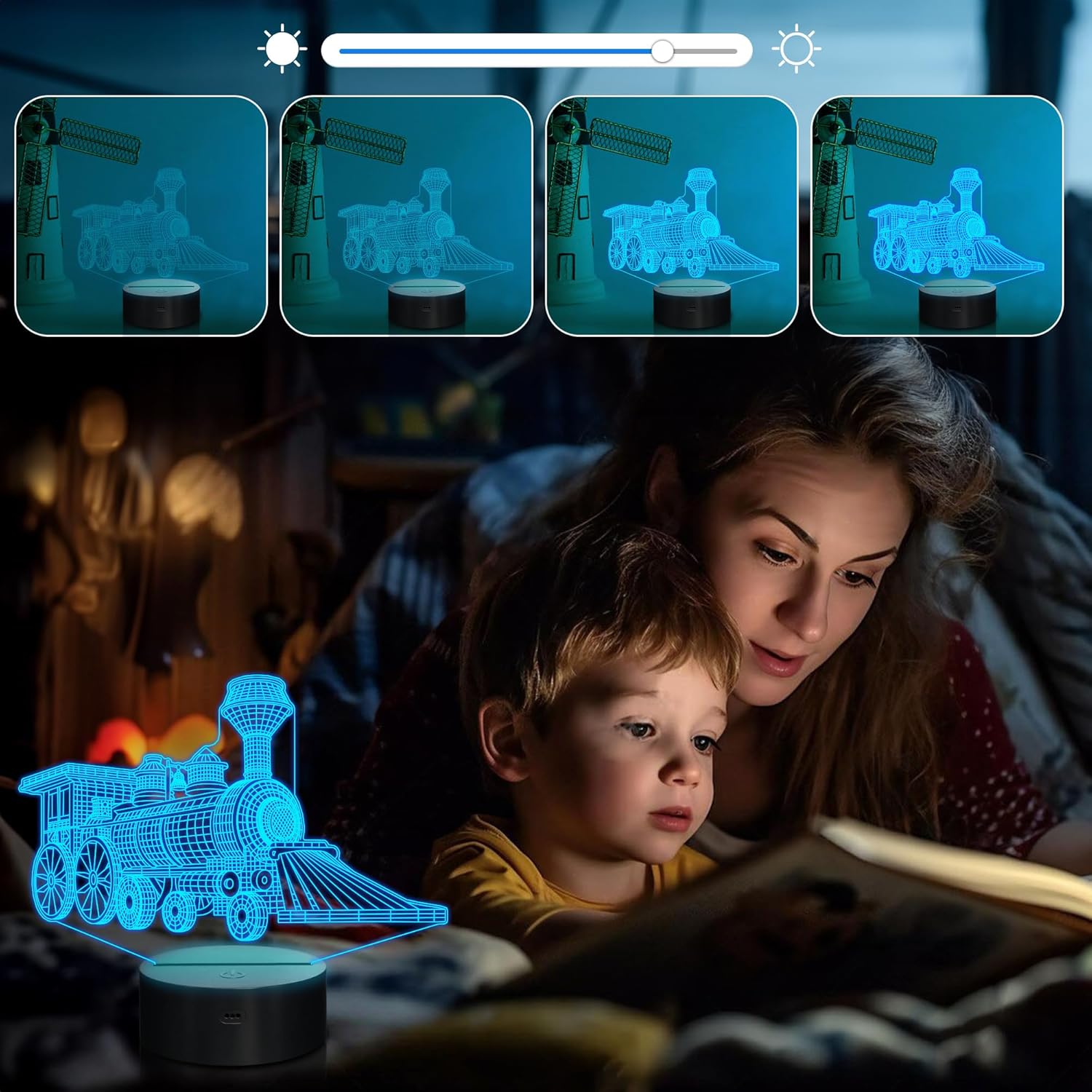 - ★【Remote Control+Timer+Dimmer+Smart Touch】Newly upgraded version train night light can be set free from 15 minutes to 12 hours. The 3d lamp has 16 colors changing and 4 kinds of flashing, and you can adjust the light brightness to not impact your sleep