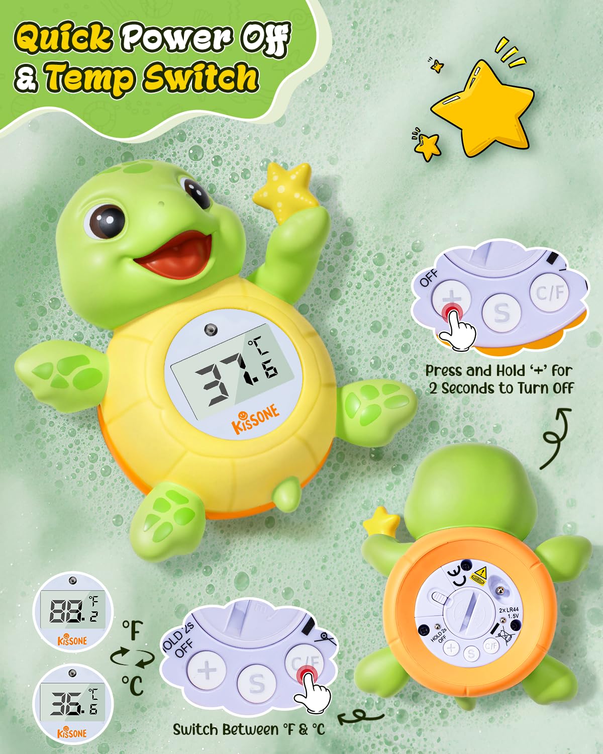 - Auto On/Off – This bath thermometer baby model automatically activates when placed in water, eliminating the need to press any buttons. It powers off automatically after 15 minutes to save battery, or you can manually turn it off by pressing and holding the ‘+’ button for a few seconds