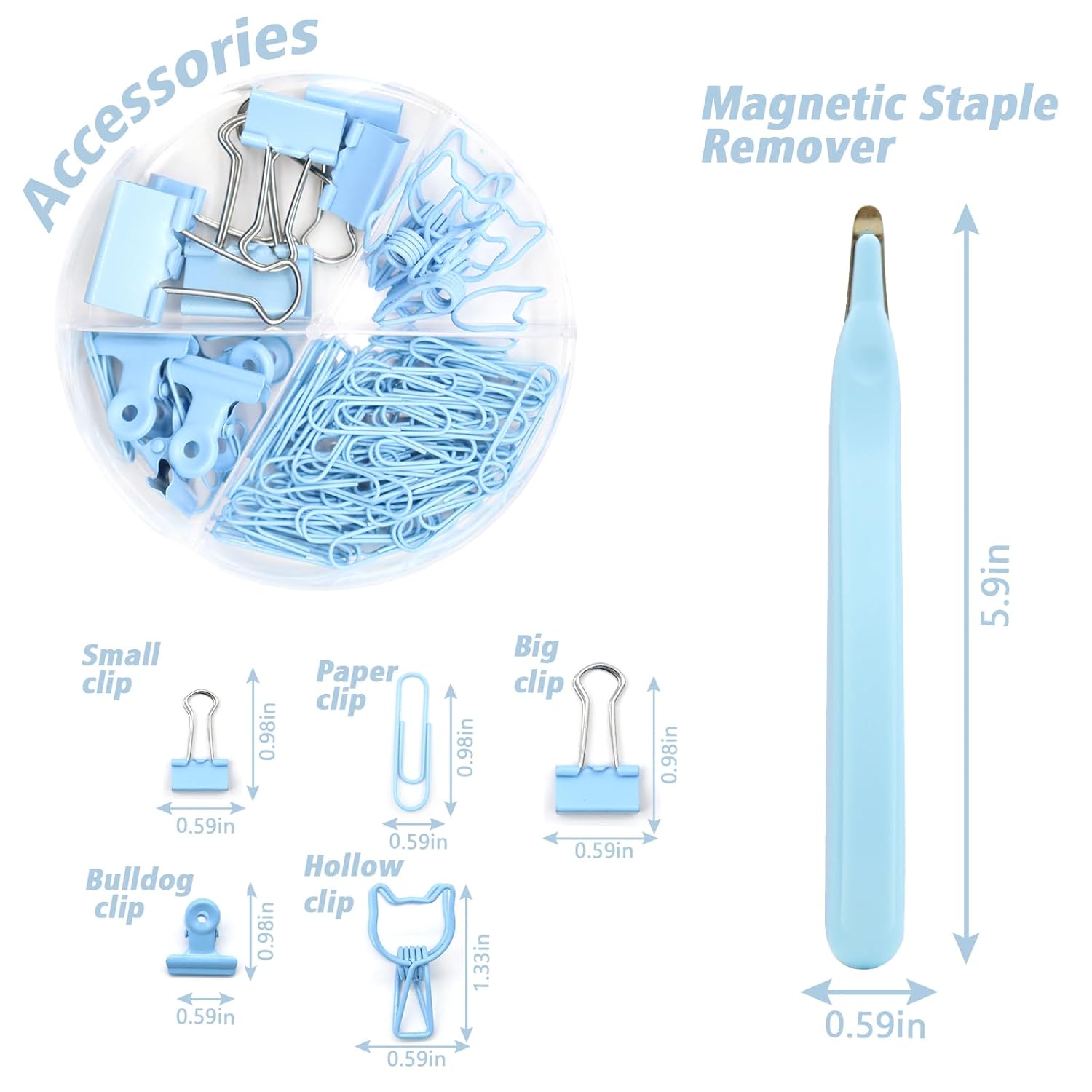 - Package Includes – This blue office supplies contains 1x Stapler, 1x Magnetic Staple Remover, 1000x Staples, 1x Tape Dispenser, 1x Single Hole Punch,4x Bulldog Clips 4x Small Clips 2x Hollow clip 2x Big Clips 70x Paper Clips and 10 colors Tabs with ruler. Beautiful and lovely blue desk accessories combination can meet your daily office and study needs.