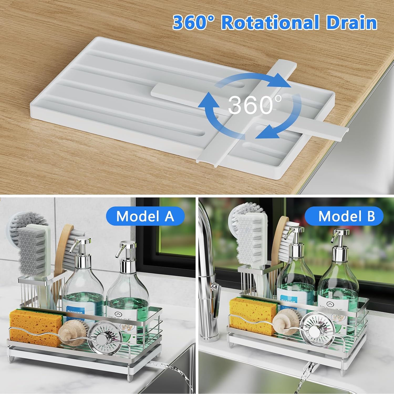 - 【360°Direction Automatic Drainage Tray】This sponge holder can 360° rotatable drainage duct at the bottom of the tray,No manual draining,can drain water easily and fast.There won’t be any water left on the countertop,helping your cleaning tools dry faster and stay clean,saving your cleaning time.