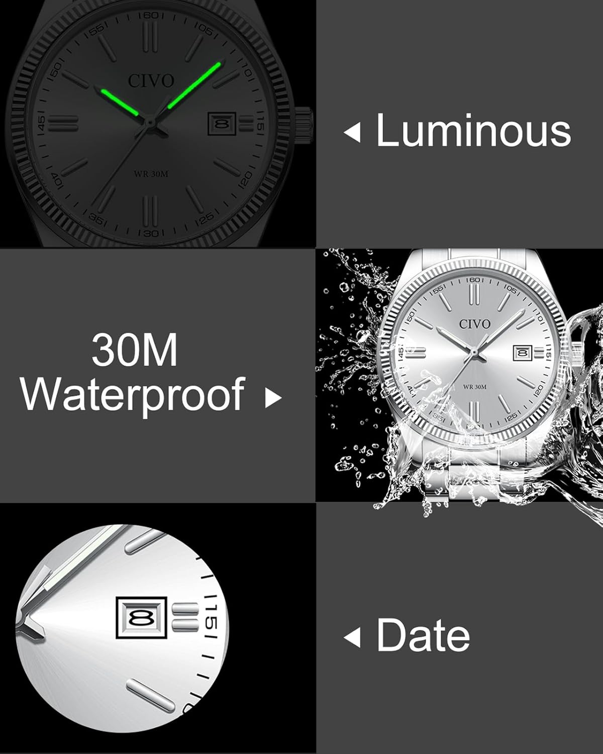 - Gifts for Men: CIVO analog watch comes in a beautiful packaging and makes a great men’s gift for Christmas, Father’s Day, Valentine’s Day, Birthdays and more. It’s suitable for most occasions, from business to leisure, from indoor to outdoor activities. Choose our silver watches for men and make a statement wherever you go