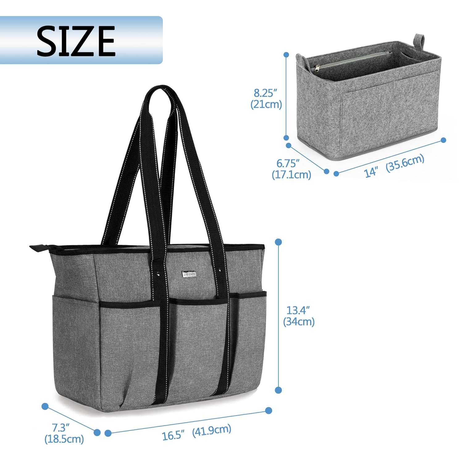 - HIGH QUALITY: Teacher Tote: 16.5’’ x 7.3’’ x 13.4’’; Insert Bag: 14” x 6.75” x 8.25”. This teacher utility tote bag is made of sturdy, lightweight fabric. Padded cushion around the bag offers great protection for your stuffs. The handles are long enough to actually carry on your shoulder.