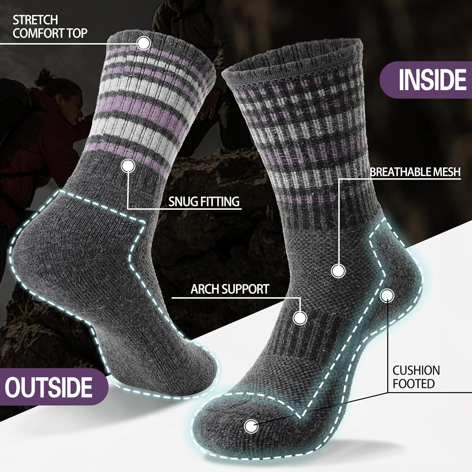 - 【Elasticity】These cozy hiking socks for women offer excellent elasticity and feature an arch stripe, promoting blood circulation, alleviating varicose vein symptoms, and ensuring sock stability. They significantly enhance comfort during hiking, running, walking, climbing, trekking, or everyday activities.