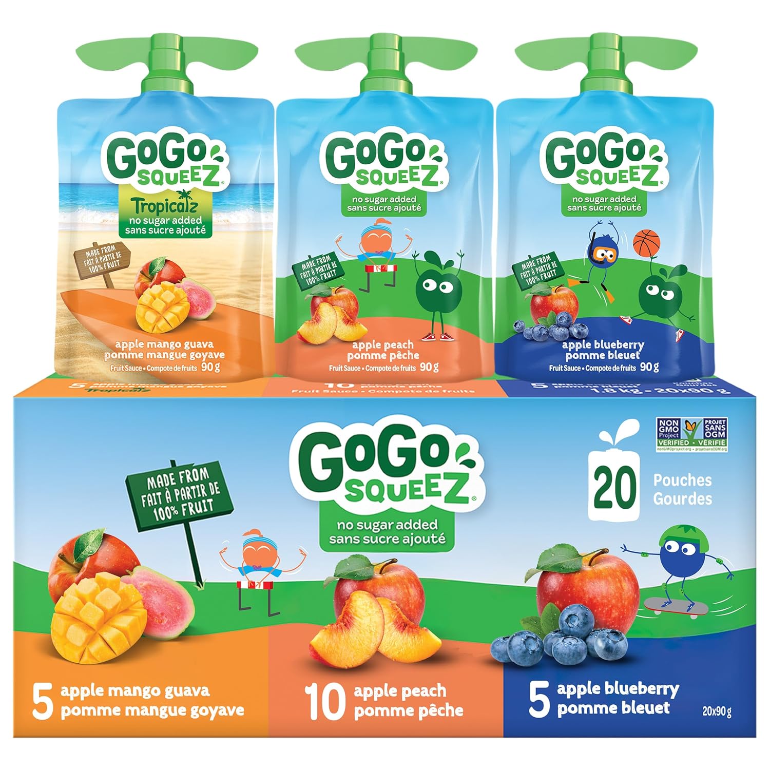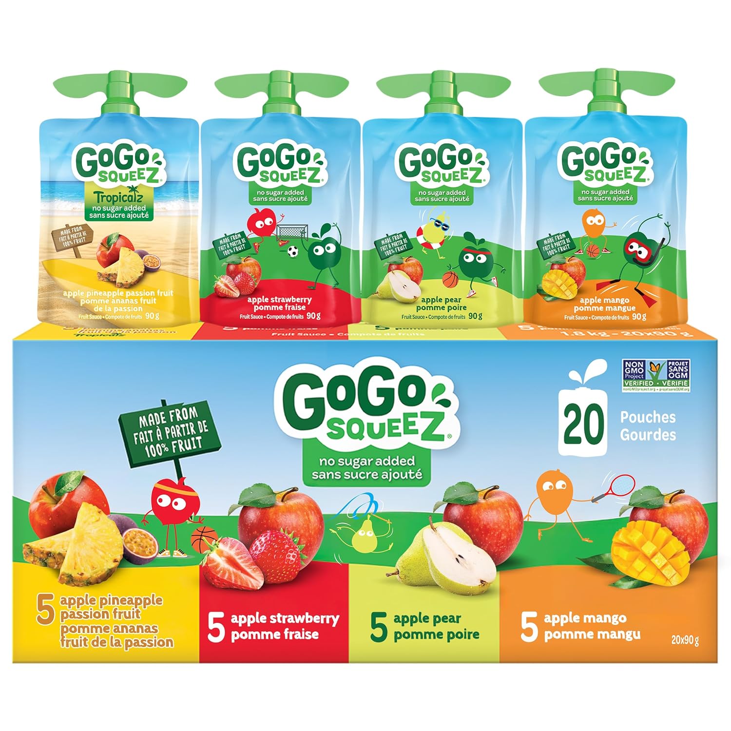 GoGo squeeZ Fruit Sauce Variety Pack, Apple, Strawberry, Peach, Banana, No Sugar Added. 90g per pouch, Pack of 20
