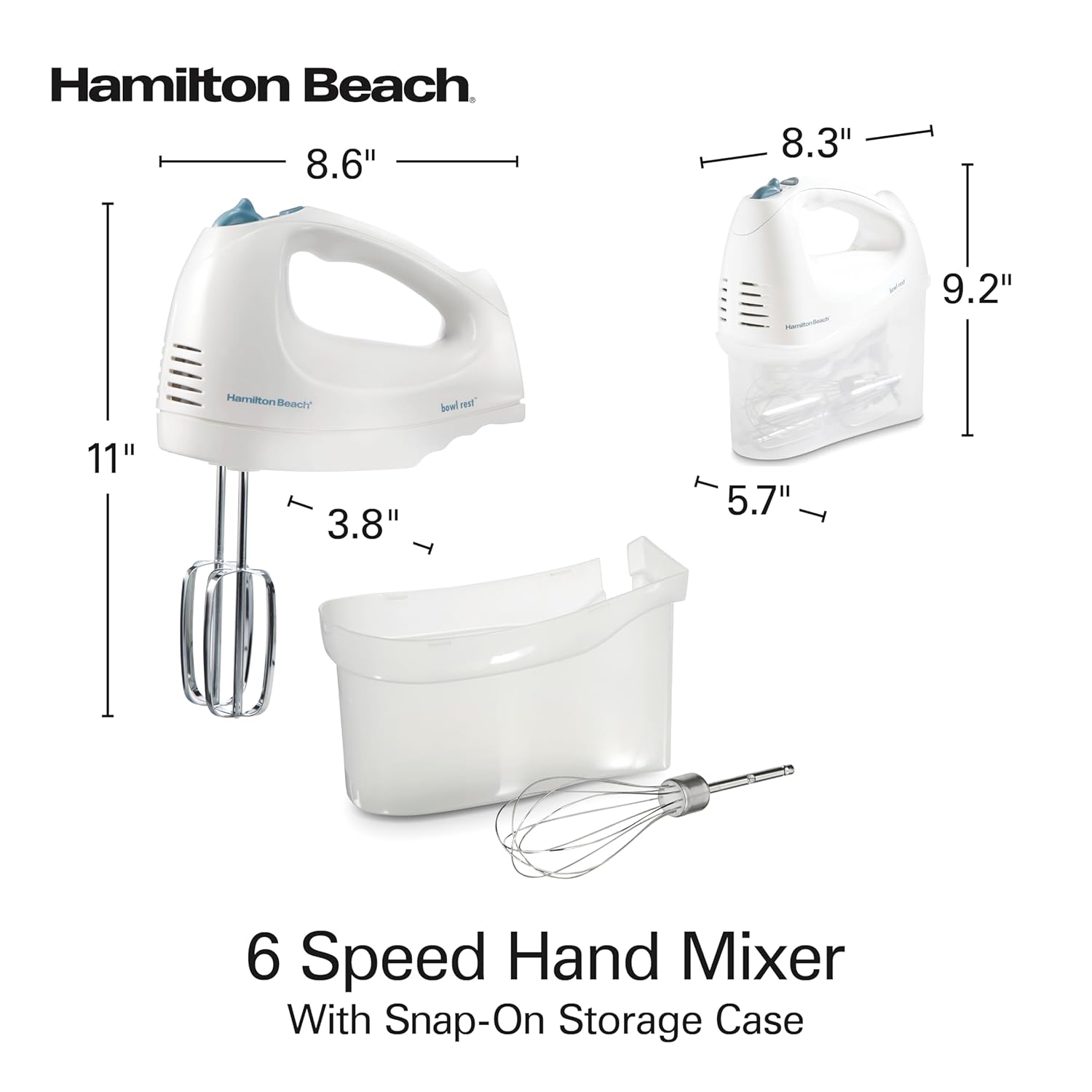 - NO MORE LOST BEATERS: The snap-on storage case that comes with the Hamilton Beach hand mixer neatly holds the 2 beaters and whisk in one easy-to-find place, reducing the chance that the attachments are lost or misplaced.