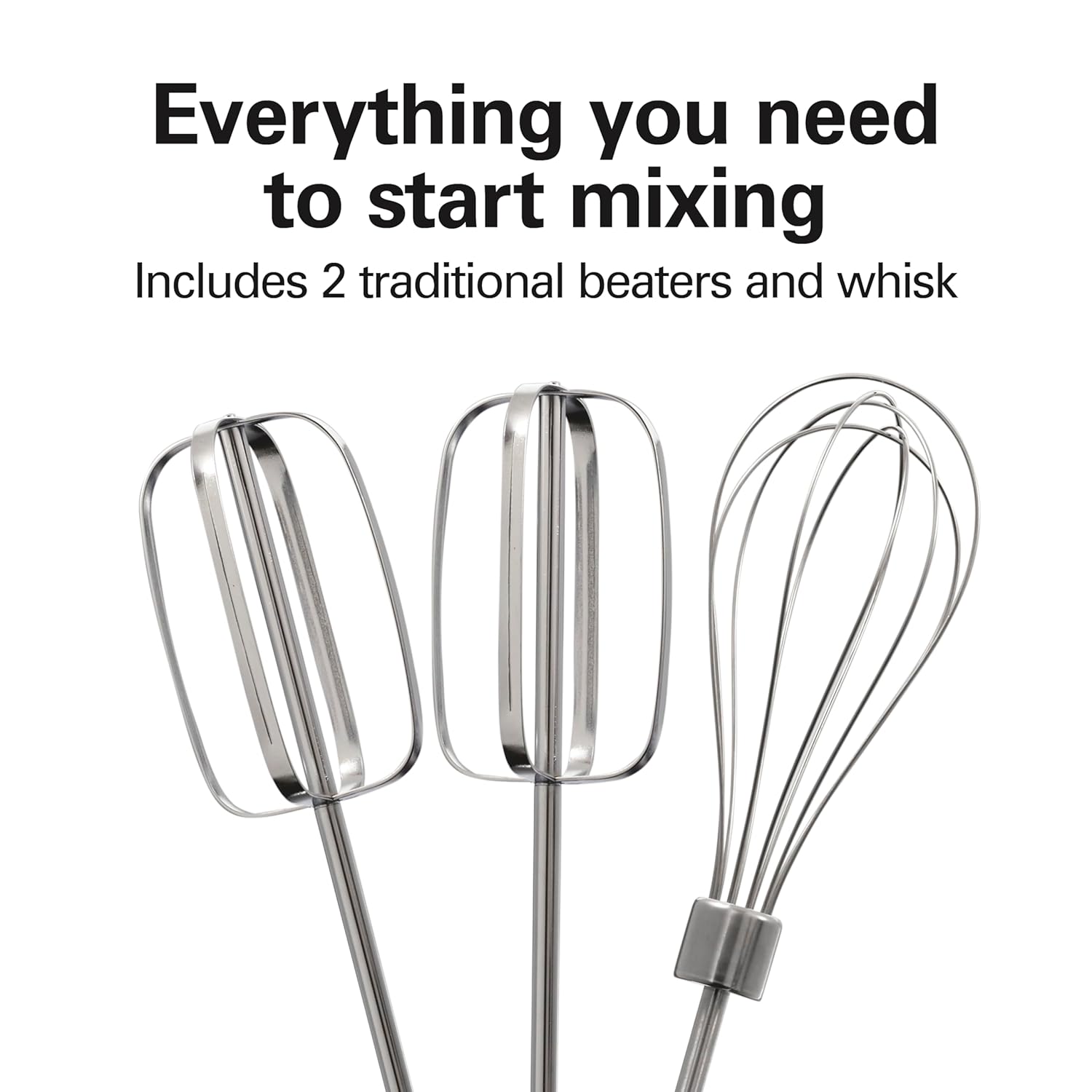 - EVERYTHING YOU NEED TO START MIXING: This hand mixer comes with 2 traditional beaters and a whisk that are dishwasher safe. After mixing, simply press the speed dial to eject the attachments from the mixer without getting your hands messy.