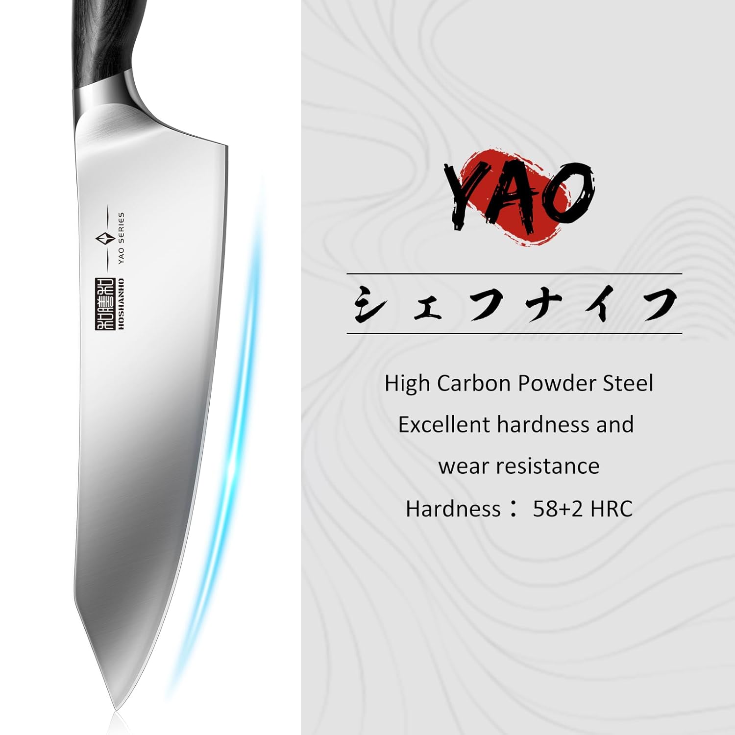 - 【Precision Forged Powder Steel】Knife set with block manufactured through powder metallurgy technology. Its microstructure is more uniform and dense, and its hardness is as high as 58+2 HRC, so it has higher hardness and wear resistance. This allows Japanese professional cutting knives to maintain sharp edges and good shape stability after long-term use.