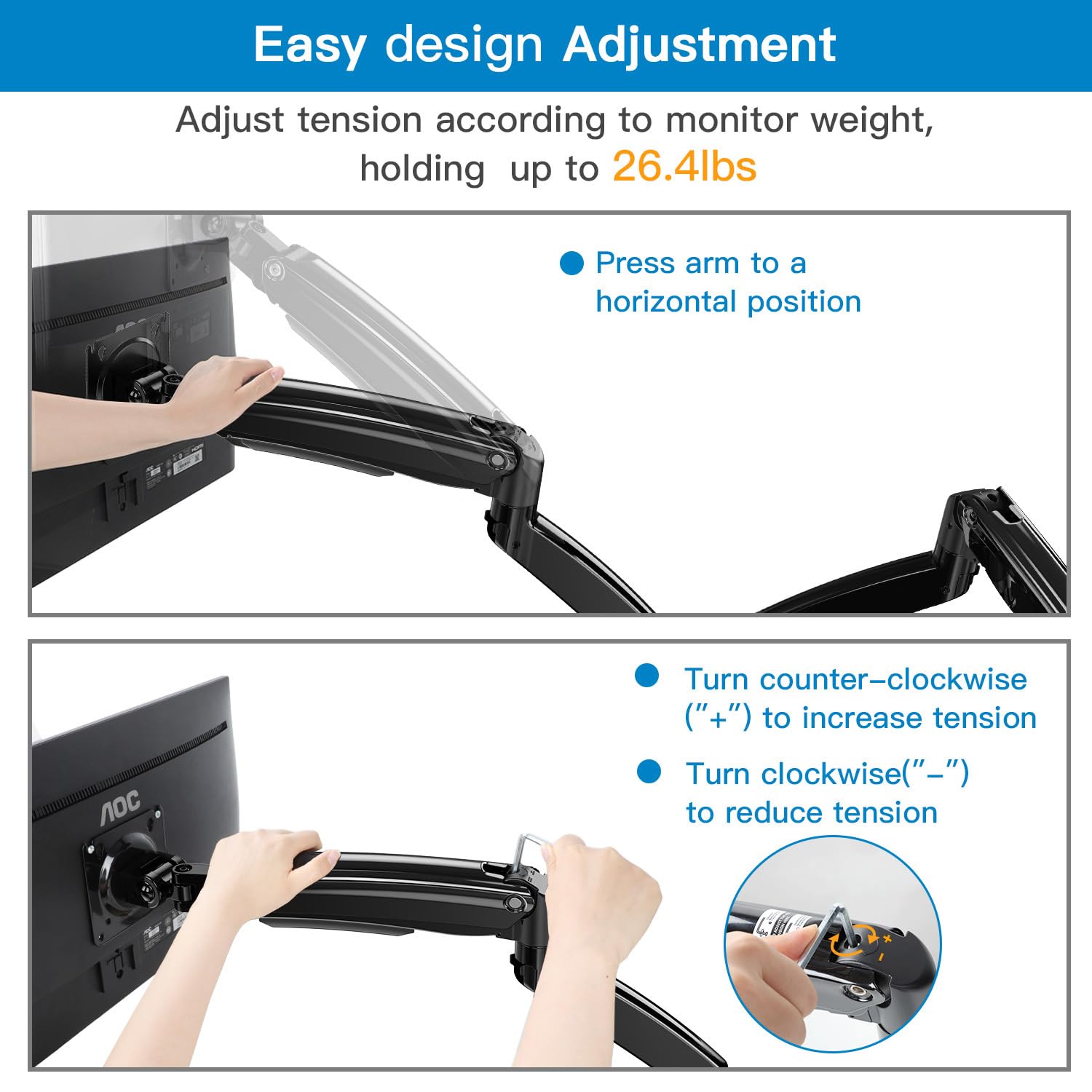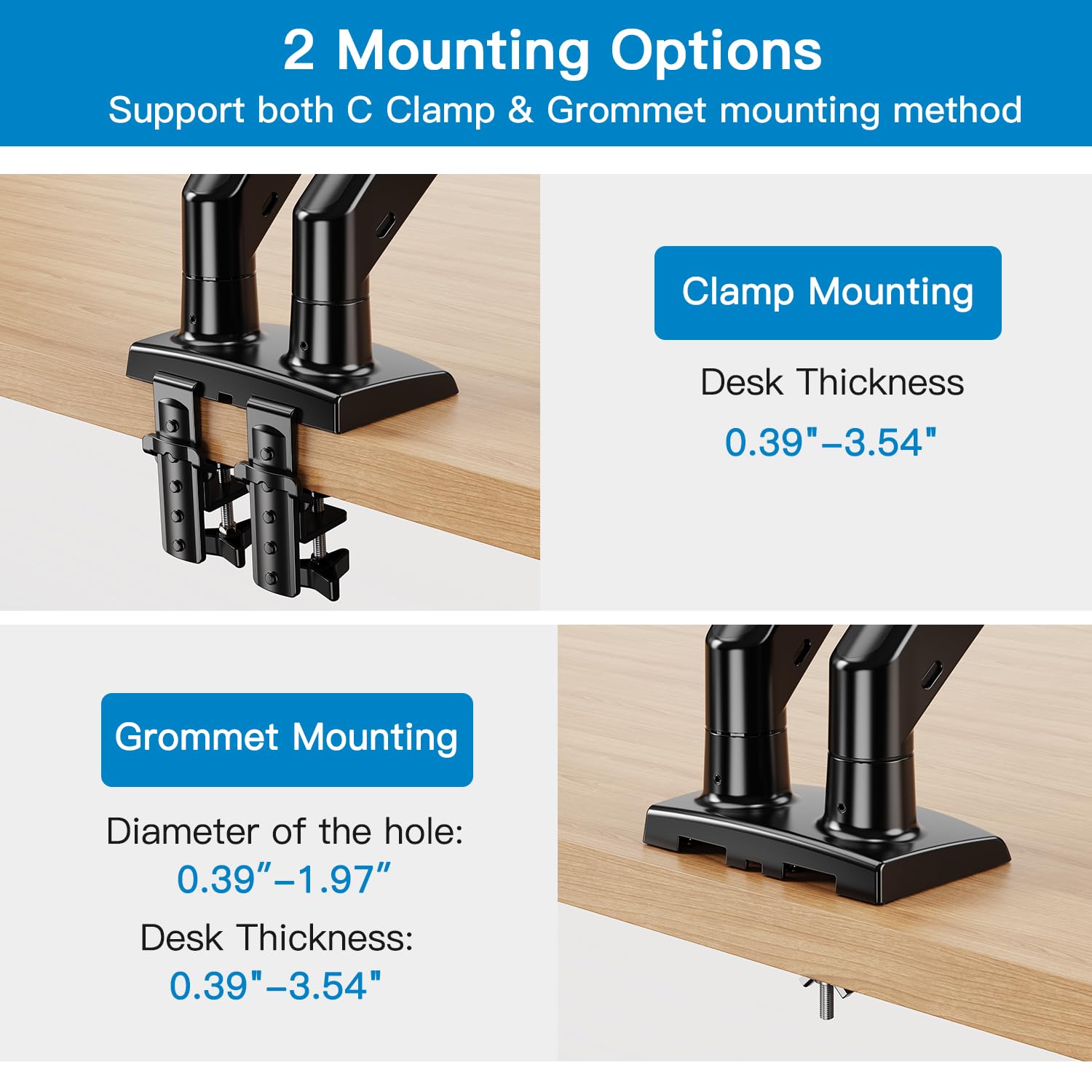 - Quick and Easy Installation—Supports both clamp and grommet mounting, fitting desks up to 3.54 inches thick. The monitor arm features grommet holes between 0.39 and 1.97 for secure installation, making it compatible with a variety of desk types and monitor mount configurations.