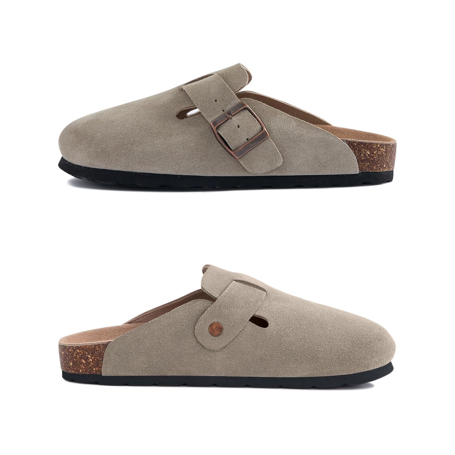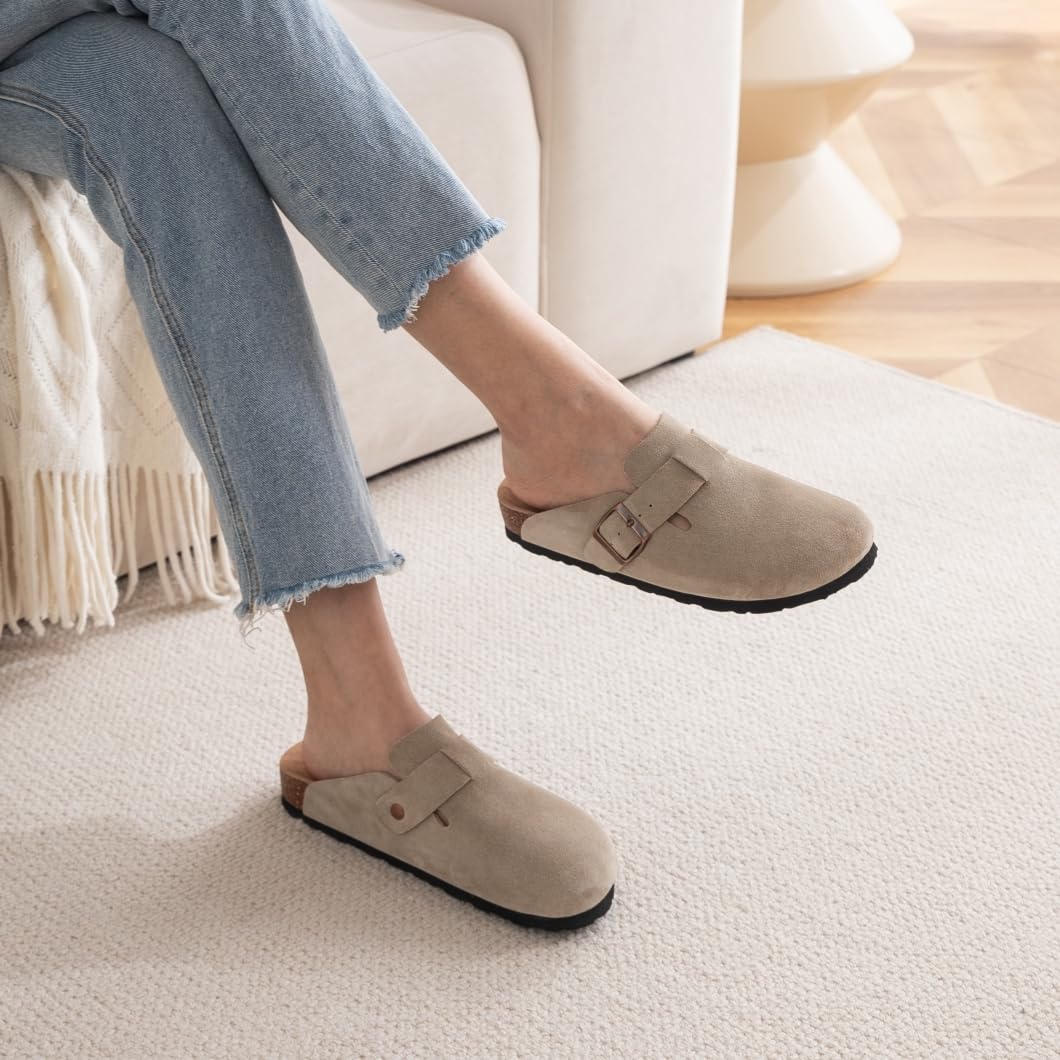 IIITHREE Women's Suede Clogs Cork Footbed Clogs for Women Soft Leather Adjustable Buckle Slip-on Potato Shoes Sandals