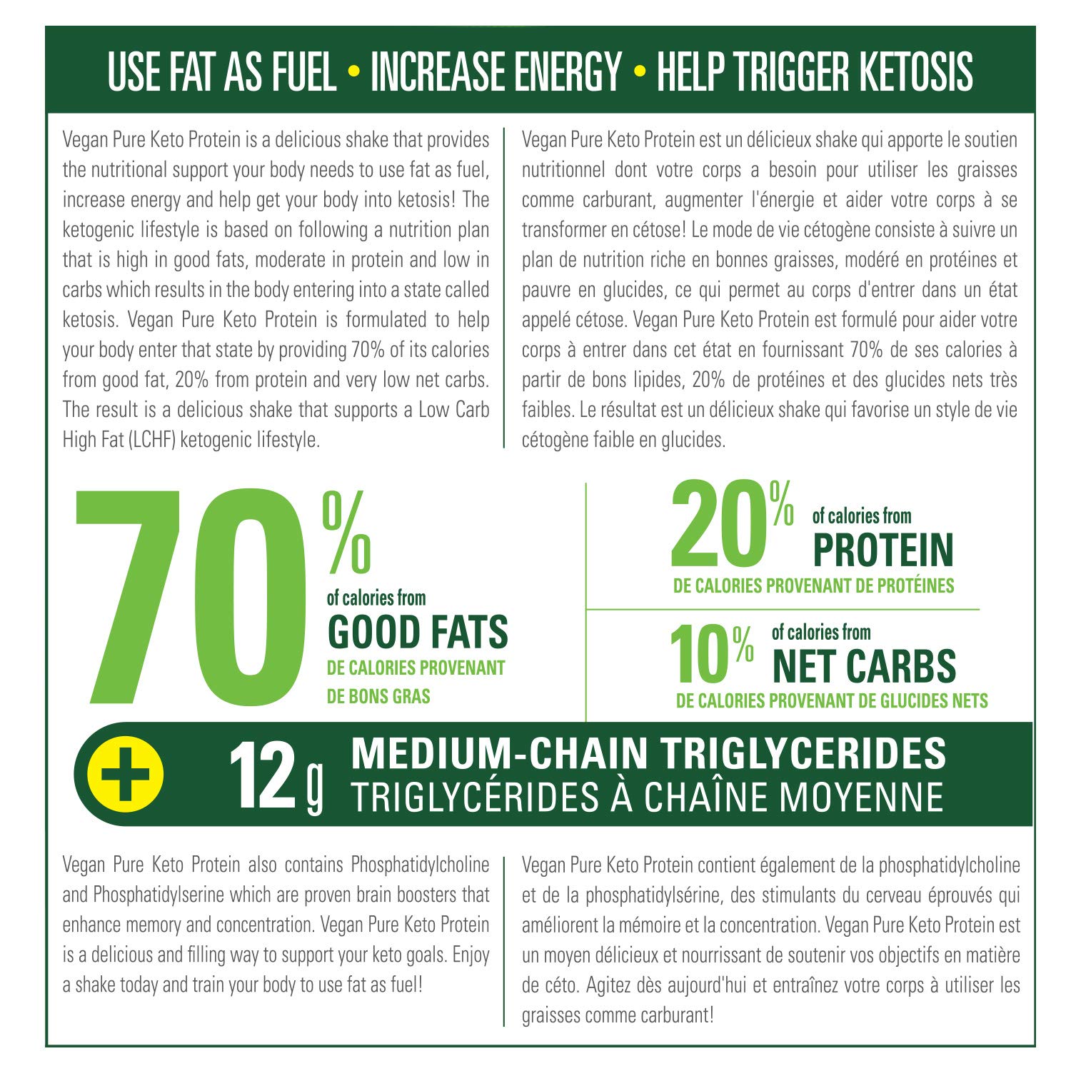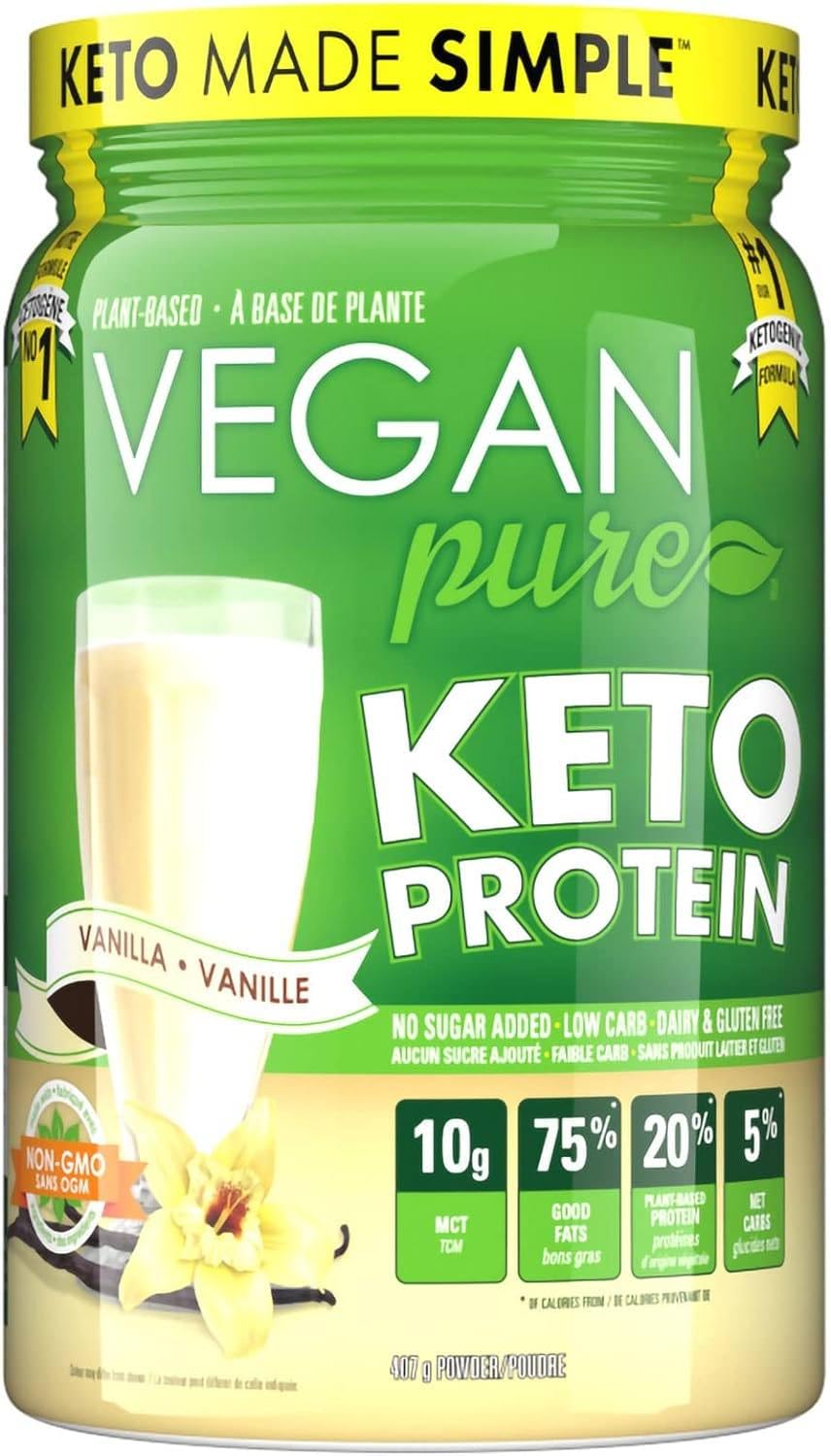 - MADE FOR KETO: Vegan Pure keto protein powder help trigger ketosis by providing the right macros. Each scoop contains 11 grams of vegan protein and 10 grams of MCT. Thus 75% of calories come from good fats, 20% from plant based protein, and 5% from NET CARBS.