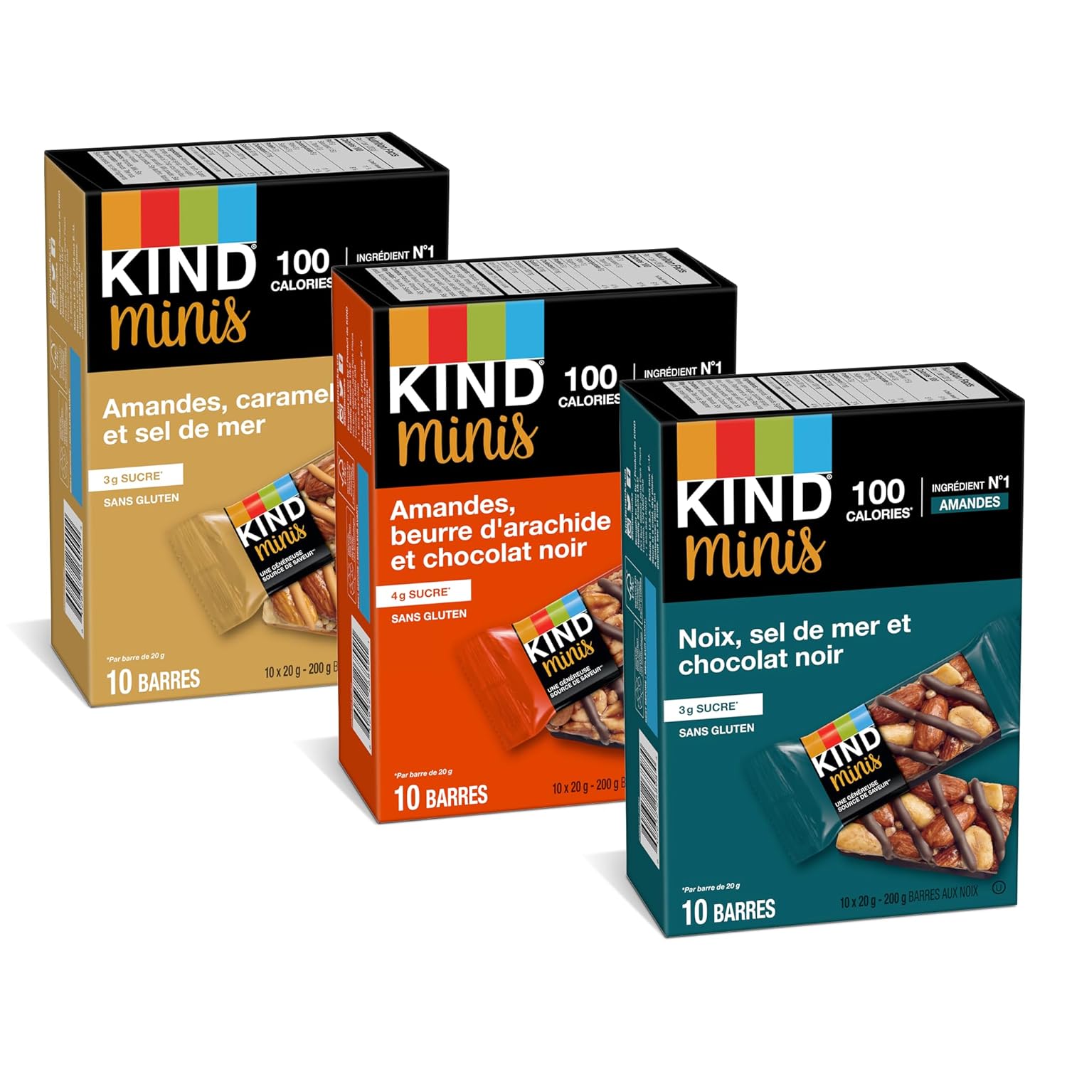 - Contains 30 – 20 gram KIND Minis. (10) Almond Dark Chocolate Nuts and Sea Sal (10) Almond Peanut Butter Dark Chocolate (10) Almond Caramel Nuts and Sea Salt