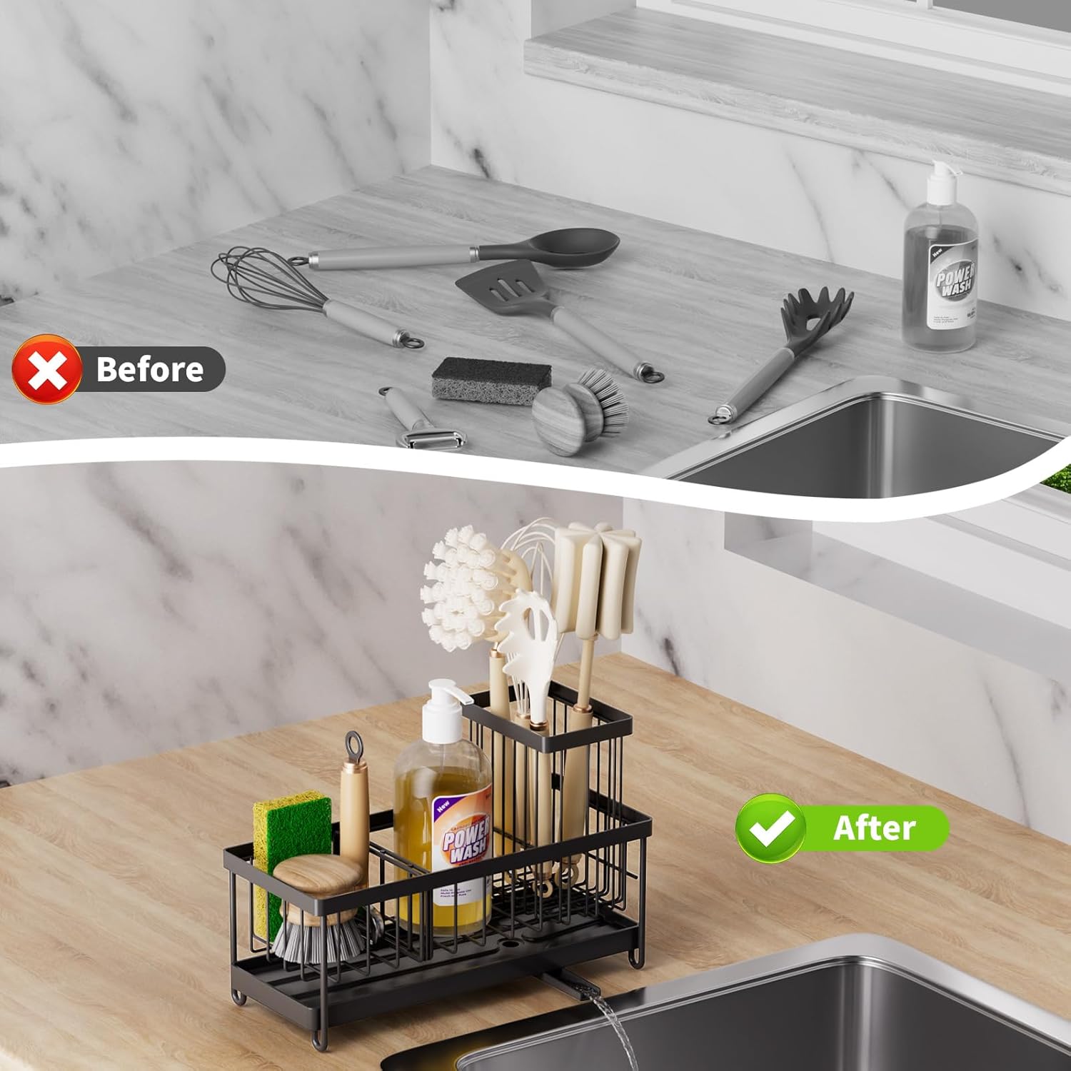 - 【Multi-functional Use】The sink organizer can be widely applied in various settings, including kitchens, bathrooms, apartments, as well as homes with American, European, and country-style decor. It can also be used in RVs and camping scenarios. After cooking or dining, it serves as a helpful assistant in managing your kitchenware and cleaning tools.