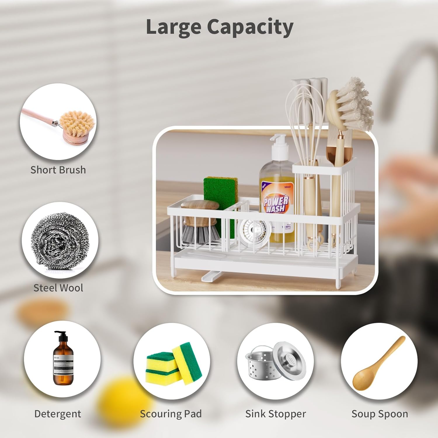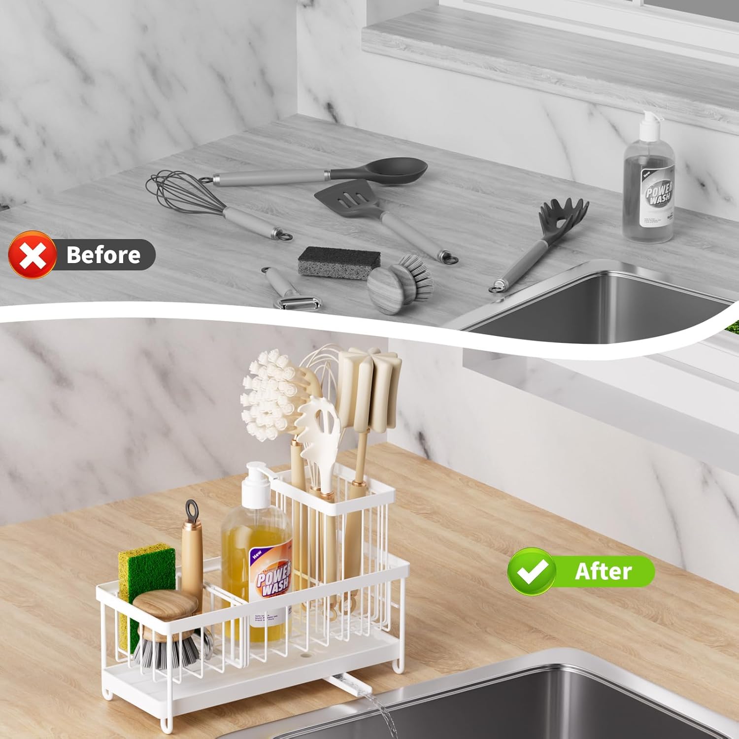 - 【Clean and Tidy Countertop Design】This kitchen sink organizer not only has practical functions, allowing for centralized storage of sponges, brushes, and dish soap to avoid clutter around the sink, but it also helps keep your countertop clean and tidy, adding more convenience to your cooking life.