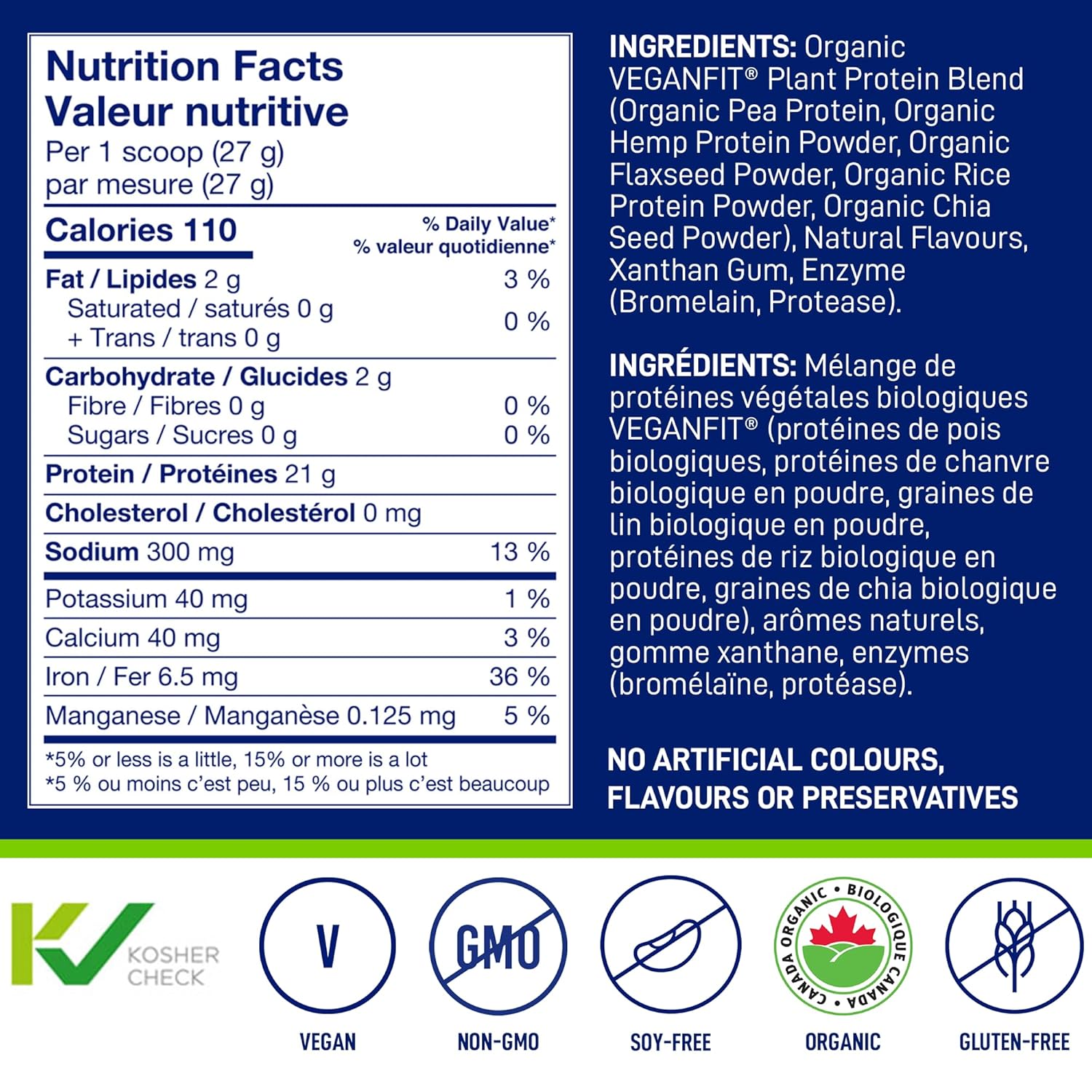 - CLEAN SOURCE: Made with certified organic plant proteins including organic pea, organic rice powder, organic chia seed powder, organic flax seed powder, and organic hemp protein powder. Vegan, kosher, non-gmo, and free of artificial colours and flavours, preservatives, soy, dairy, gluten, and more.
