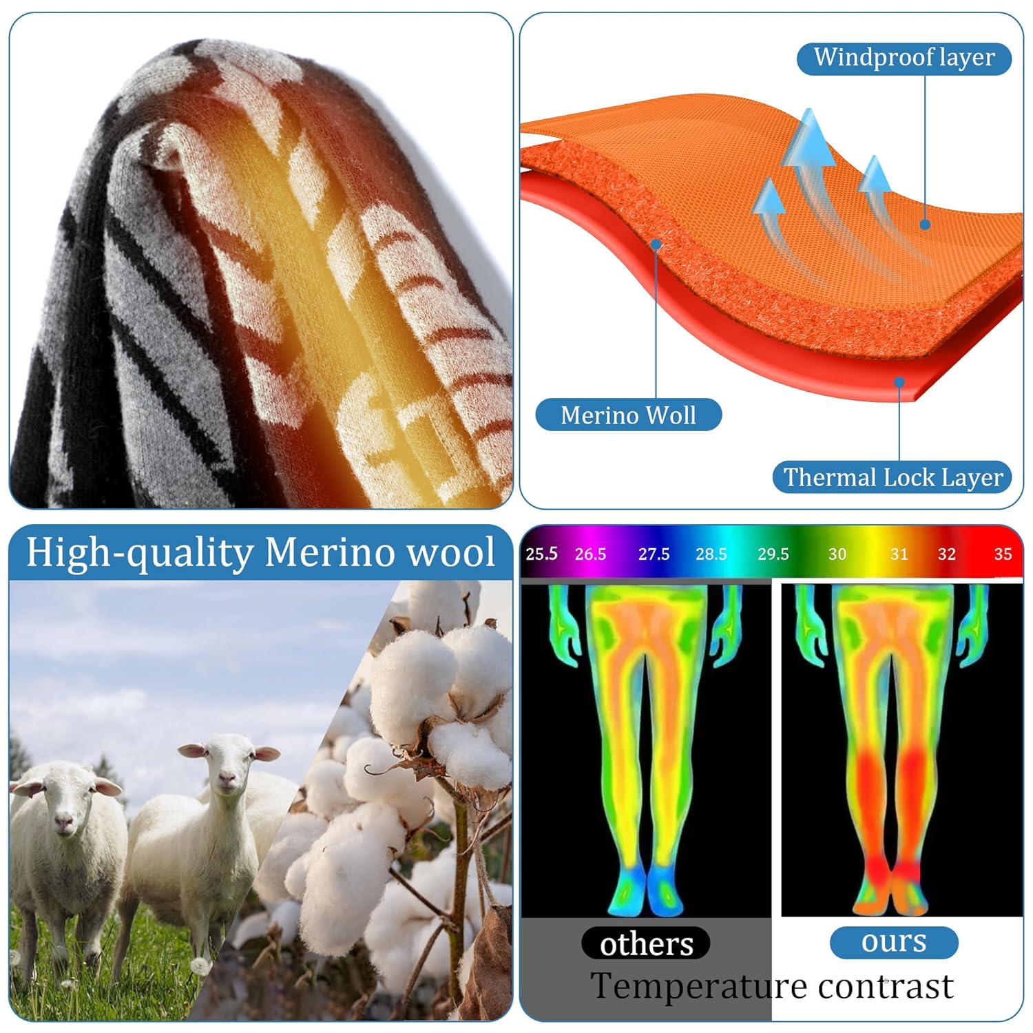 - Material: 70% cotton, 25% merino wool, 5% polyester. Cotton to keep warm and absorb sweat, wool to keep warm, polyester to increase elasticity. 144 needle knitting technology makes socks warm, sweat absorbing and elastic.