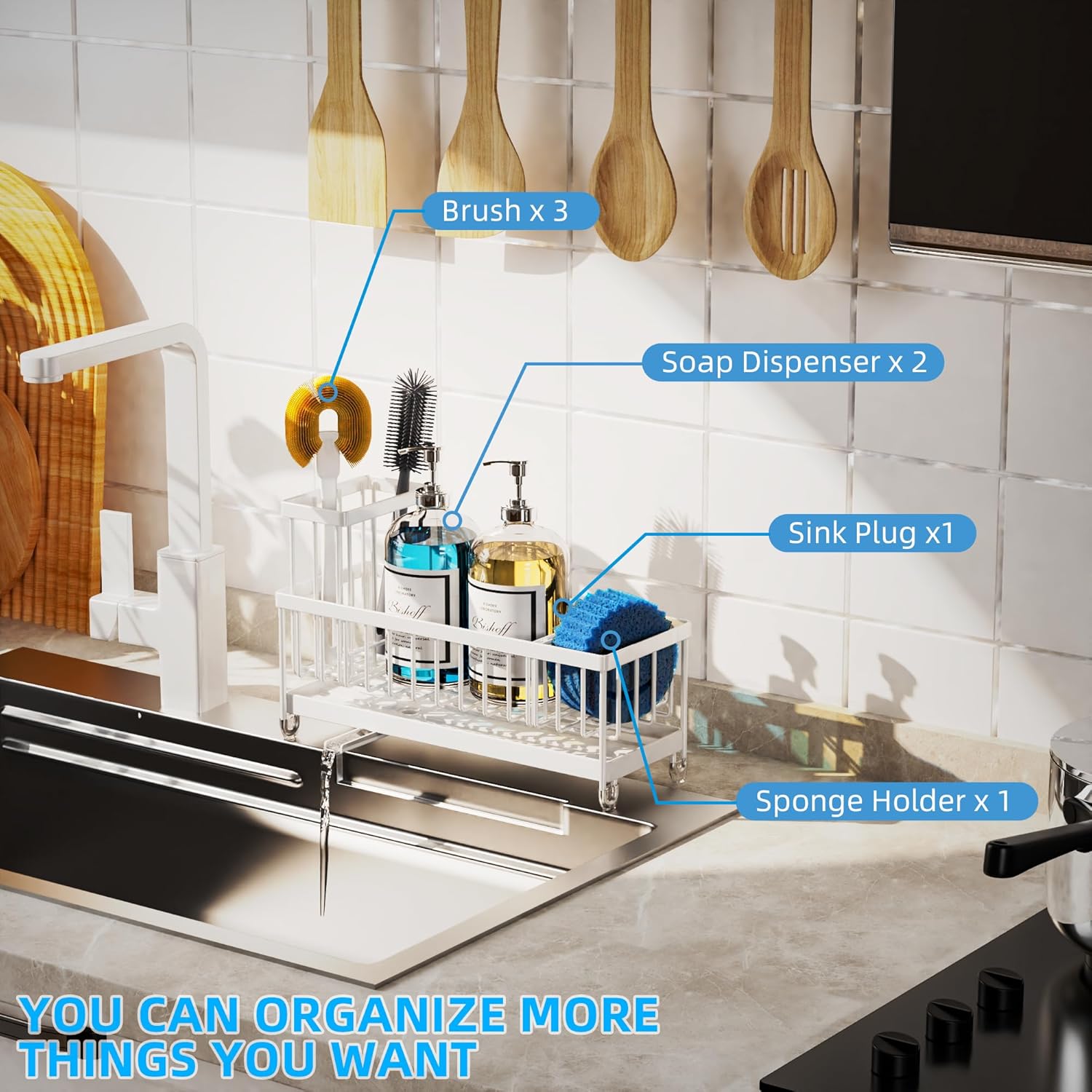 Moforoco Larger Sponge Holder for Kitchen Sink, Sink Caddy with High Brush Holder, Kitchen Sink Organizer Countertop Rustproof 304 Stainless Steel (White)