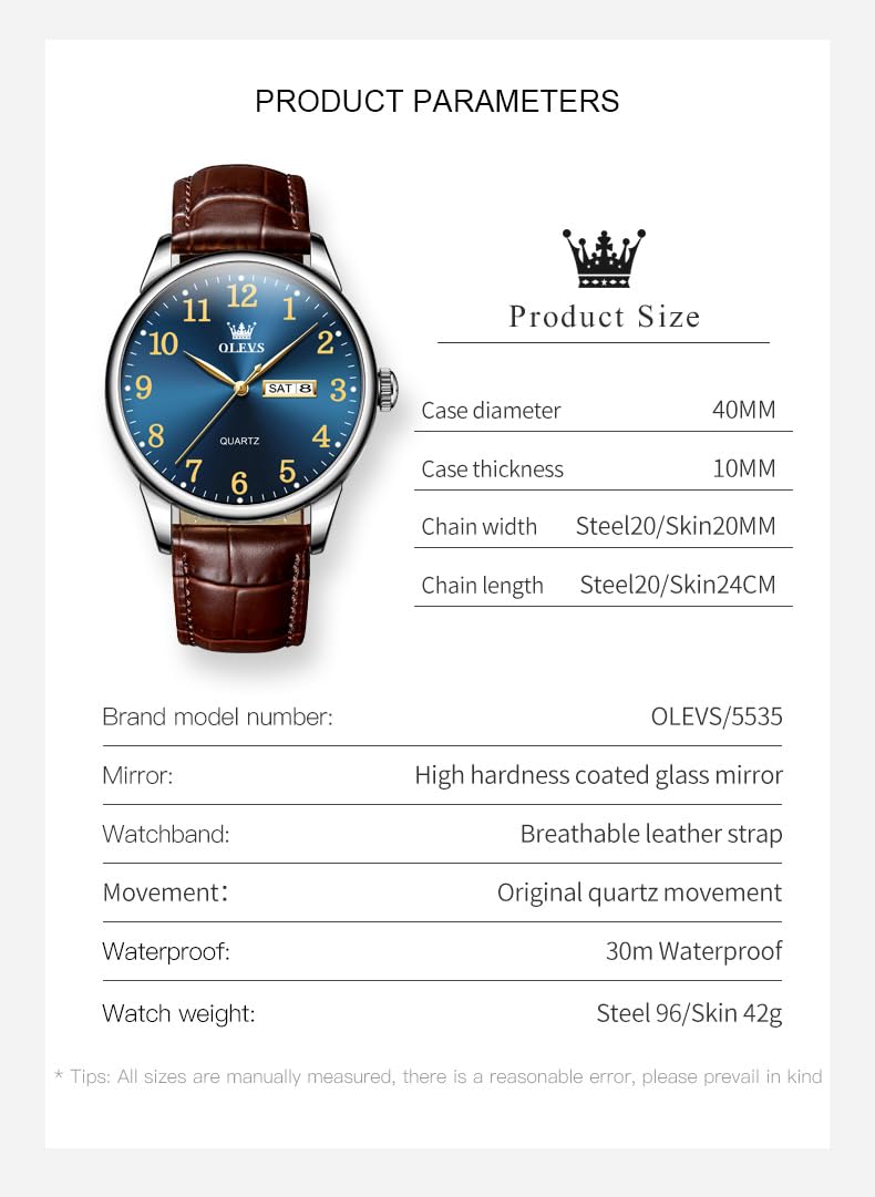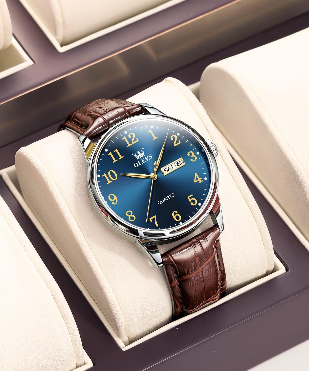 13 reviews for OLEVS Men Leather Watches for Men Arabic Numerals Men Easy Read Watches, Simple Style Calendar Large Face Watches (White/Black/Blue Dial)