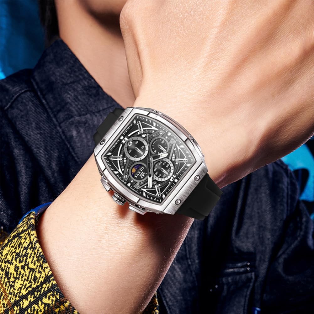 - Unique Design Men’s Watch: Stylish tonneau shaped men’s watch with large face skeleton moon phase design and multiple colorways for you to choose from. Silicone strap design combines sports and leisure perfectly, suitable for many indoor and outdoor scenes