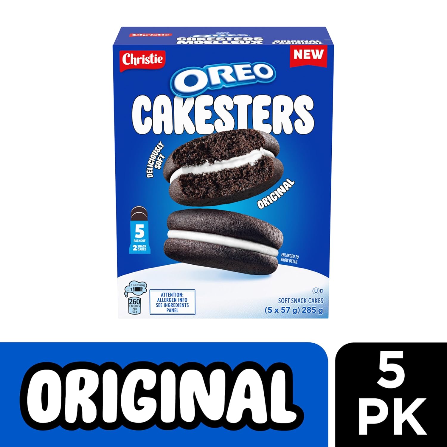 - One 285g box with five 57g snack packs of two OREO Cakesters Soft Snack Cakes
