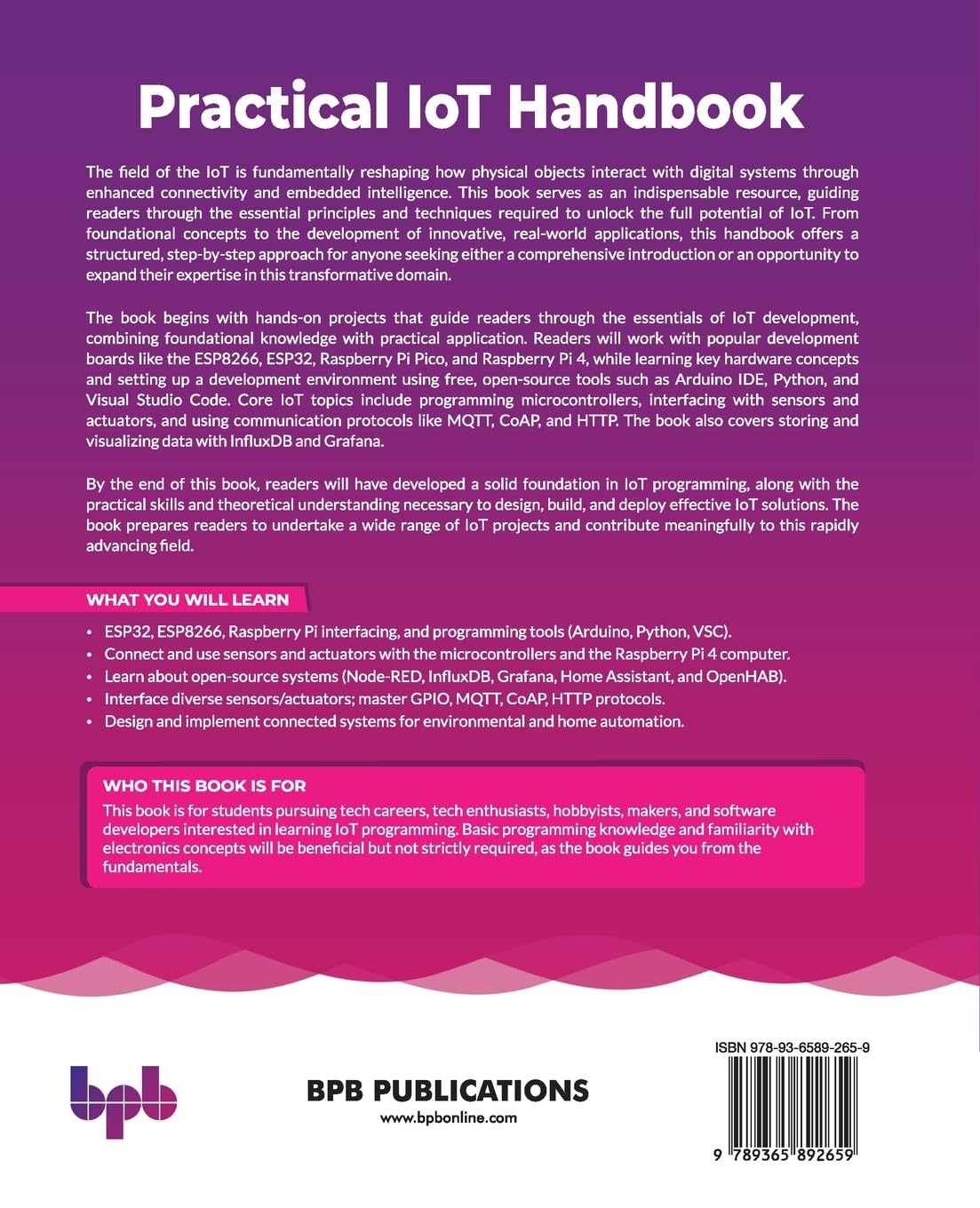 The field of the IoT is fundamentally reshaping how physical objects interact with digital systems through enhanced connectivity and embedded intelligence. This book serves as an indispensable resource, guiding readers through the essential principles and techniques required to unlock the full potential of IoT. From foundational concepts to the development of innovative, real-world applications, this handbook offers a structured, step-by-step approach for anyone seeking either a comprehensive introduction or an opportunity to expand their expertise in this transformative domain.