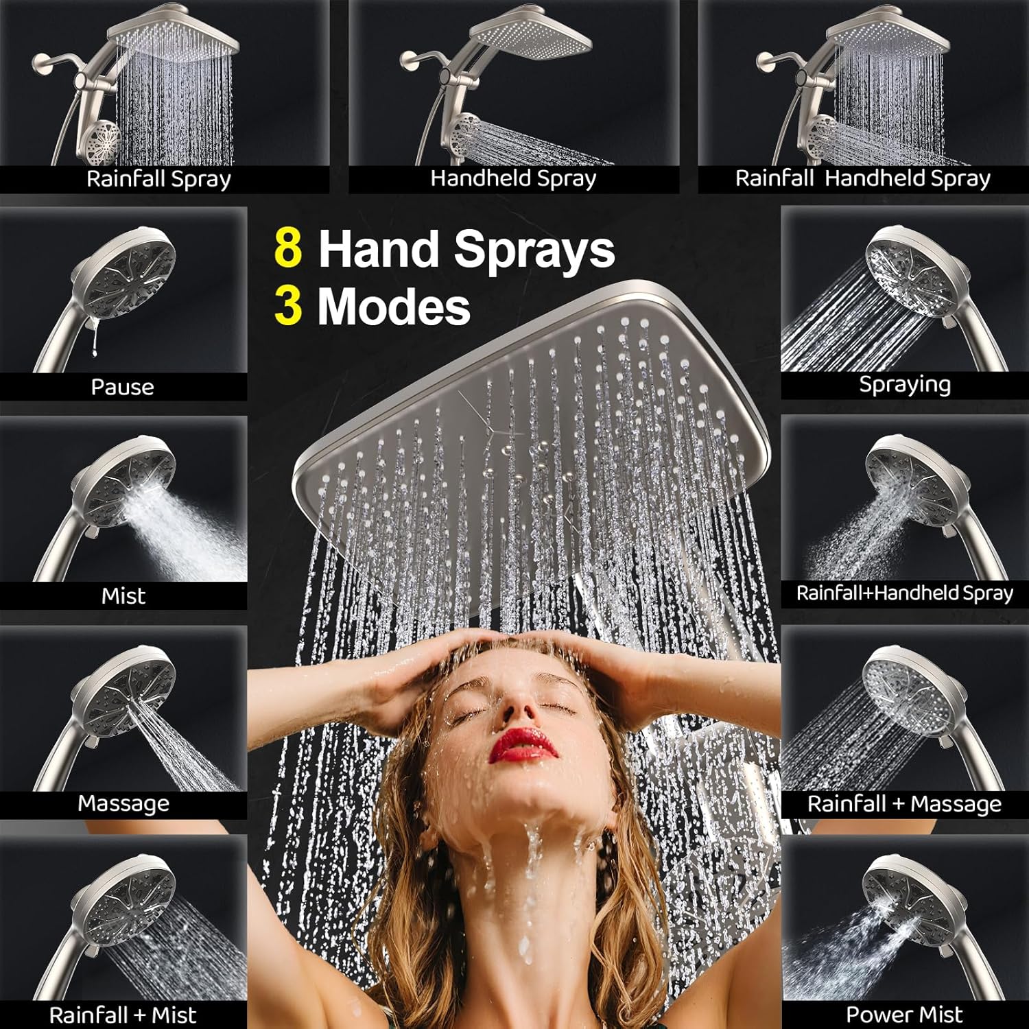 - Effortlessly switch between the immersive rainfall shower head for full-body relaxation and the focused high pressure handheld shower head for targeted cleaning or invigorating massage. Two showers in one for the ultimate convenience