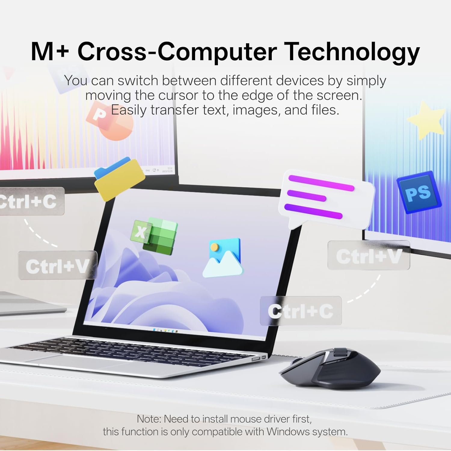 - 【M+ Cross-Computer】 Seamless flow between screens by simply moving the cursor to the edge, wireless transferring files by copying from one computer and pasting on the other.