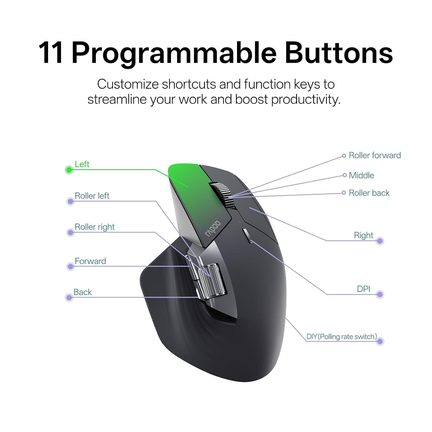 RAPOO MT760 PRO Wireless Mouse, NearLink + Bluetooth 5.0 Multi-Device, 12K DPI, 2K Polling, Ergo for Work & Gaming, 11 Programmable Buttons, On-Board Memory, Quiet Clicks,…