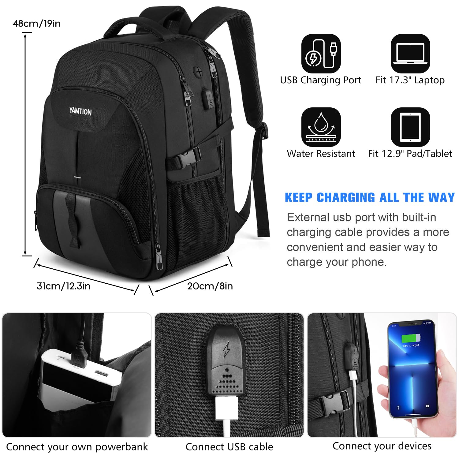 - USB Port and Headphone Jack:This laptop backpack features a convenient USB port and built-in headphone jack, allowing you to easily charge devices and enjoy music or calls on the go. (Power bank not included.)