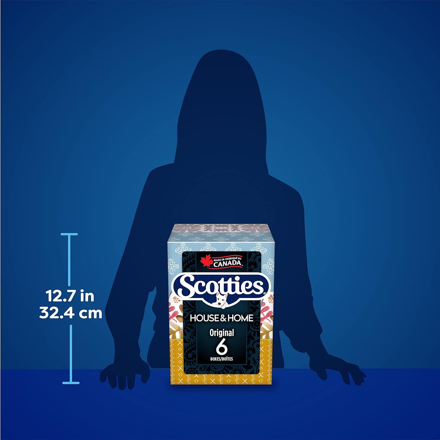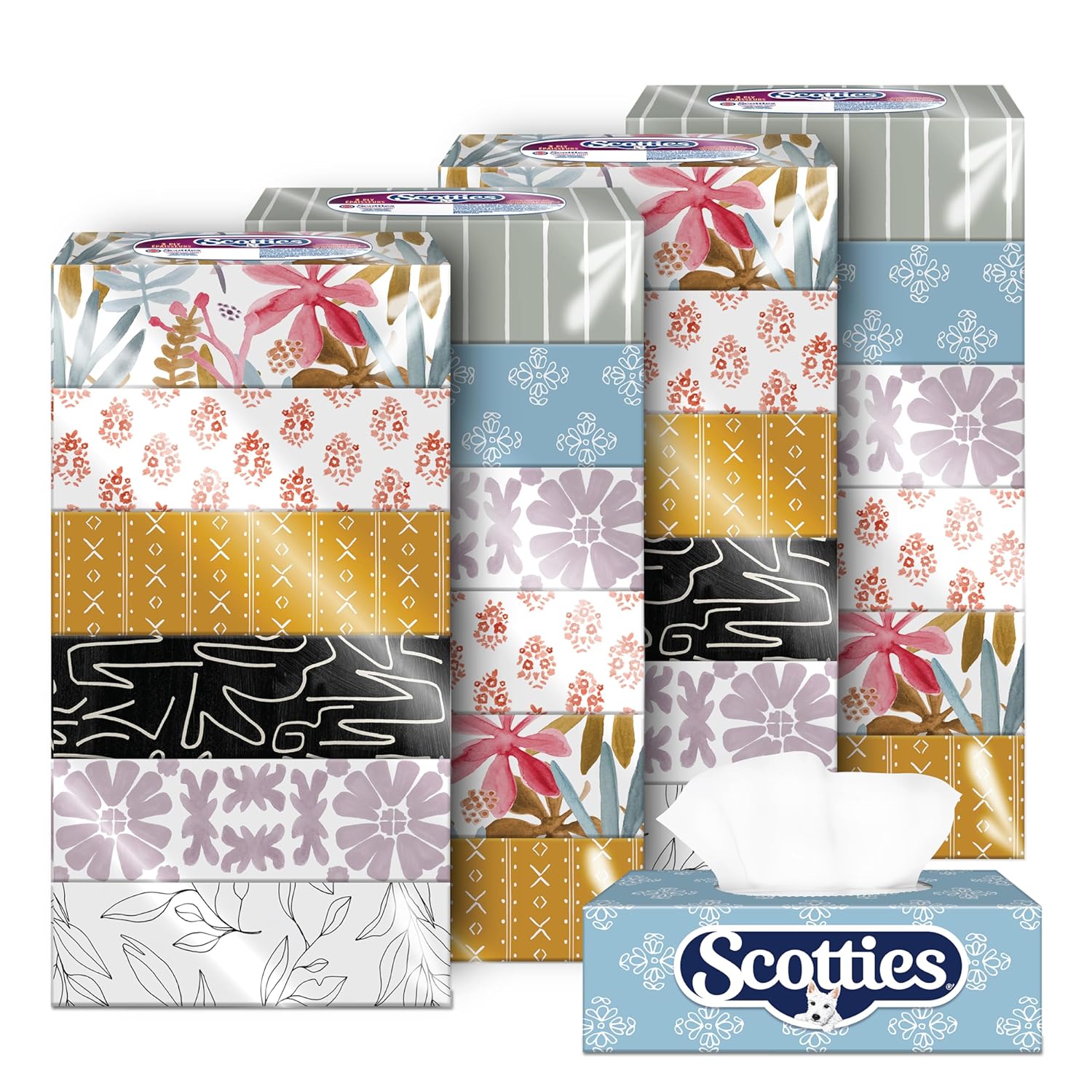 - Contains 6 boxes of Scotties Original House & Home Designer Series facial tissue, featuring on-trend designs created in partnership with House & Home. Contains 126 2 ply tissues per box, 756 tissues in total. Designs may vary and cannot be guaranteed.