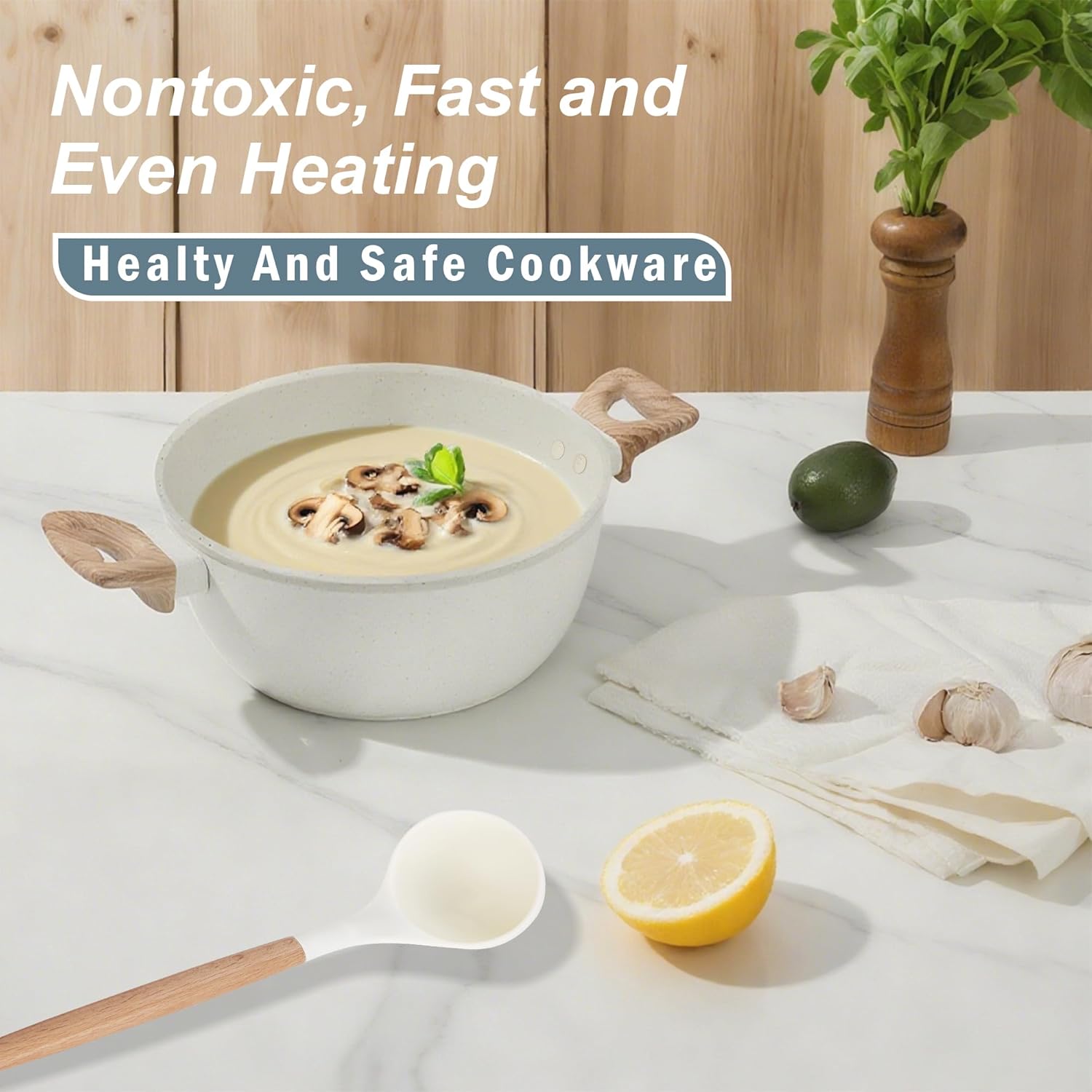 - ✔ Complete 11-Piece Cookware Set – Includes everything you need for versatile cooking: 8″ & 9.5″ frying pans, 3 QT stock pot with lid, 2 QT & 1.5 QT saucepans with lids, plus a ladle, spatula, and tongs.