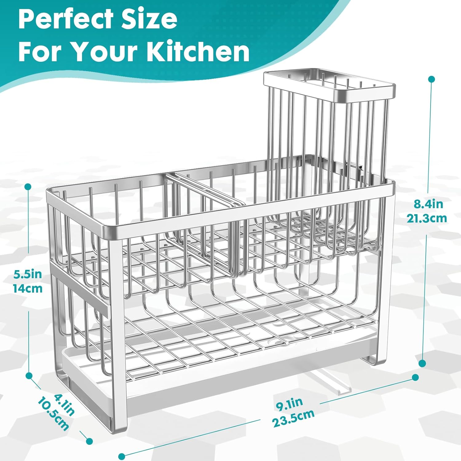 Perfect size and provides good space saving. The sponge holder/divider is detached, which some may like to accommodate different sponge sizes. I find it a little annoying because it wobbles over every time you use the sponge.