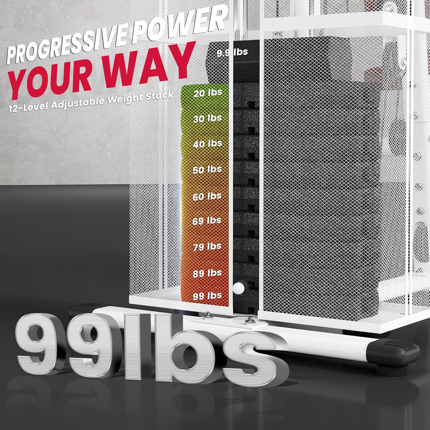 - Robust Construction: This workout machine is made of a strong steel tube, the counterweight block protective by steel mesh guarantying your training to the greatest extent. Nylon-coated steel wires were tested 1000 lbs capacity.