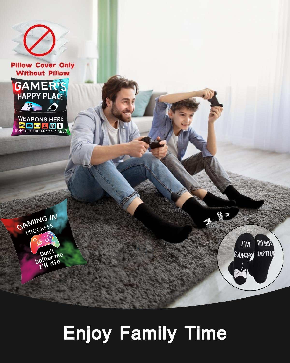 - Gamer Gifts: Best Christmas gifts Birthday Gifts for Gamers teenage boys Girls Men Sons Grandchildren Boyfriends. This personalized gift basket will bring fun to them, which includes 1* soft velvet fabric 18*18inch gaming pillow cover (cover only, insert not included) and 1* pair of Do Not Disturb I’m Gaming Socks. Are you ready to receive praise from game players?