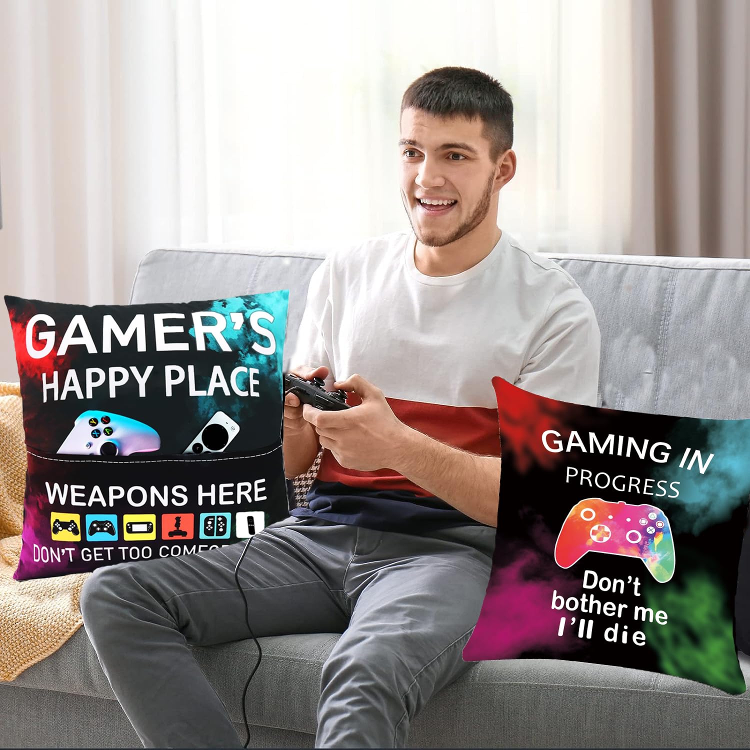 - Double-side Printed Gaming Lovers Pillow Case:The words “GAMER’S HAPPY PLACE” printed in the front side It is a good way for game players to really “keep” their position on the couch! The back side is printed with “GAMING IN PROGRESS, Don’t bother me,I’ll die” together with an image of gaming signs. This pattern will lighten the mood and make everyone laugh happily!
