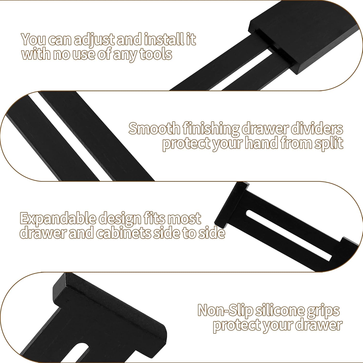 These dividers are also adjustable and expandable. You just need a little bit of elbow grease to apply pressure on the end of the divider in order for it to fit inside the drawer. By doing this, the built-in spring will compress and the divider’s length will shorten, allowing you to properly adjust it in place. Once you let go of the divider, the spring will expand and the length of your divider will have adjusted to the exact depth or width of your drawer. This same mechanism ensures that the divider will stay in place after the initial installation. Once it has been set up, it can easily be re-adjusted or removed entirely. All you need to do is ”squeeze” the ”spring-loaded-end” that will then slide into a slot inside the divider. This will in effect, ”shorten” the divider, making it possible to adjust it or remove it. Additionally, each end of the dividers has rubber pads to protect the drawer at each anchor point.