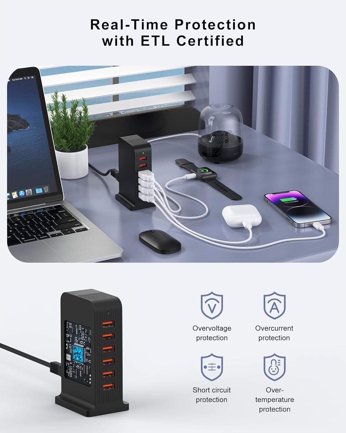 - ETL Certified for Safety and Reliability:Your device’s safety is a priority. This charging station is ETL Certified, complying with Canadian safety standards. It features a built-in multi-protection system that safeguards against over-voltage, over-current, overheating, and short-circuiting, protecting your valuable electronics during charging.