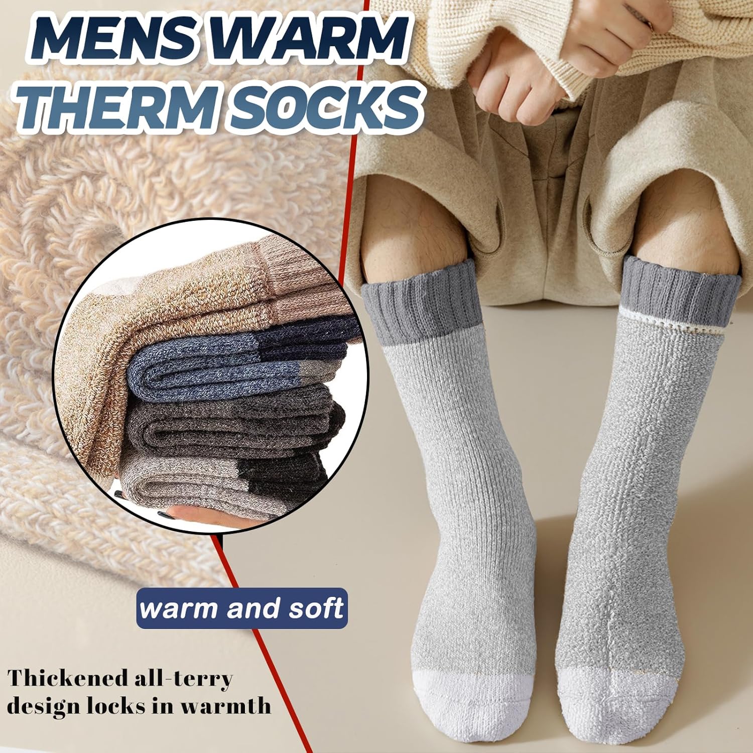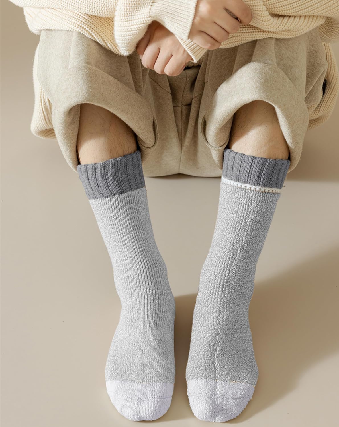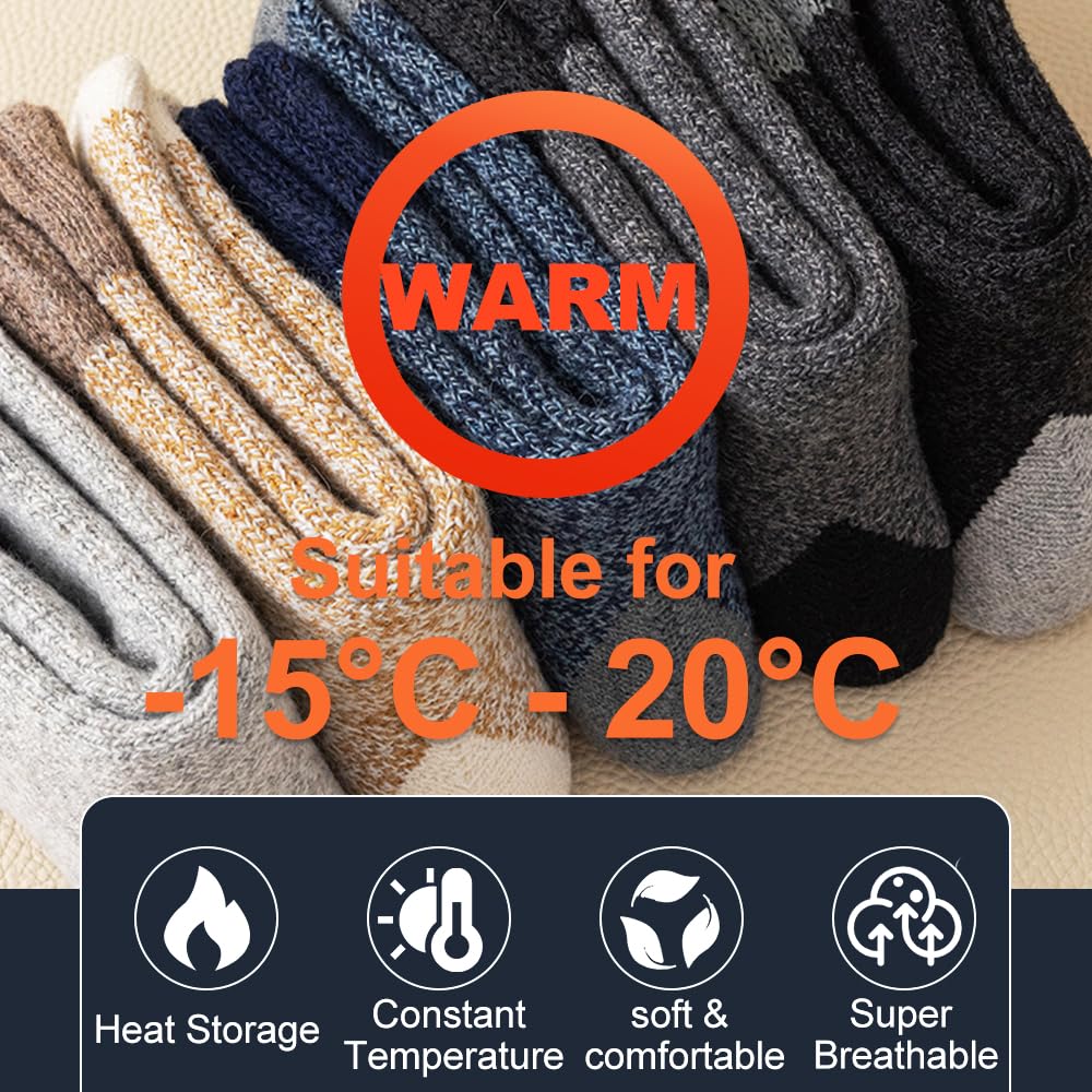 - High-Quality Blended Fabric, Double Warmth And Comfort: These thermal socks for men are crafted from a scientific blend of premium wool and polyester. While retaining wool’s natural warmth, the polyester enhances the fabric’s stretch and durability. The thickened terry design inside can quickly lock in heat, and the thick texture keeps your feet from freezing in the cold winter.