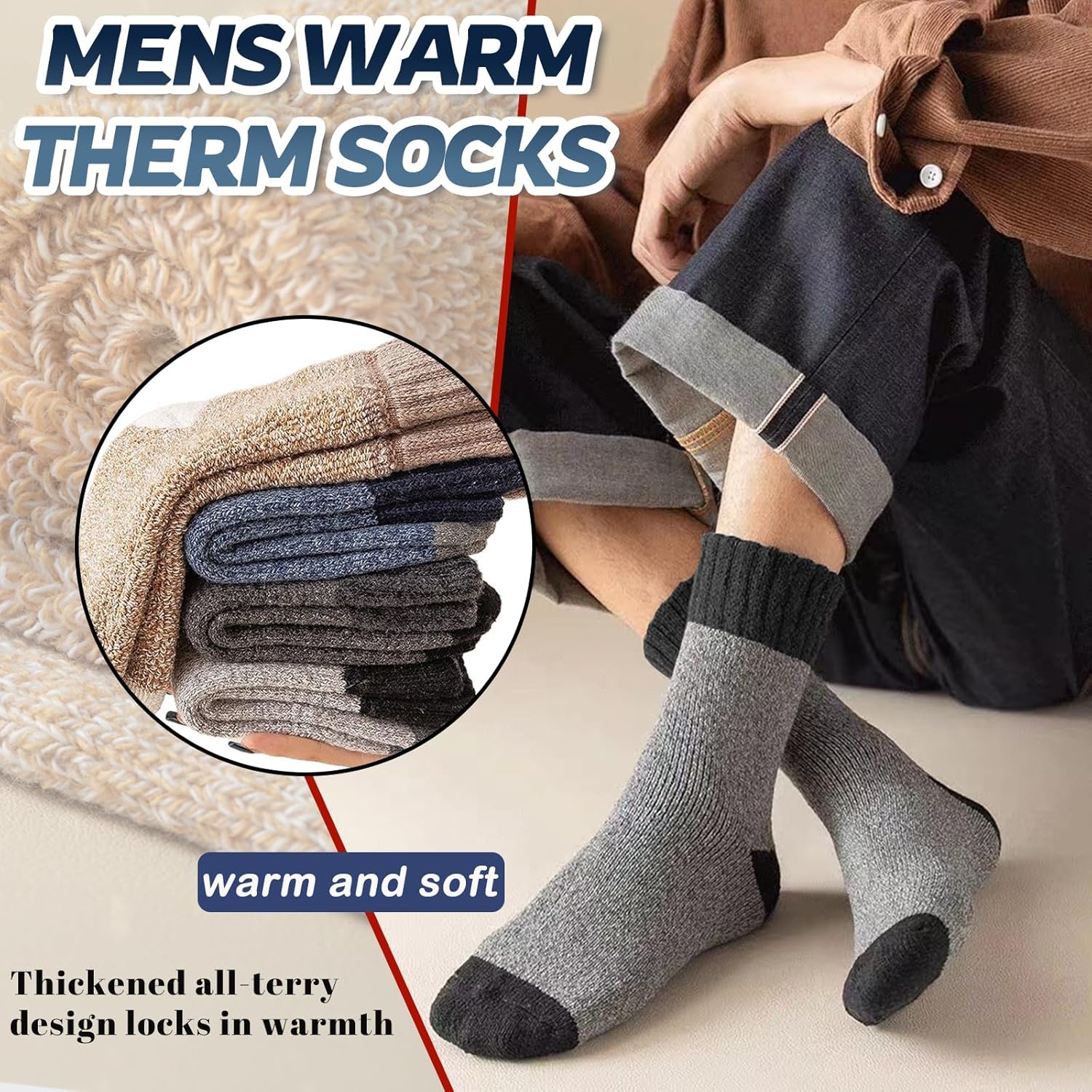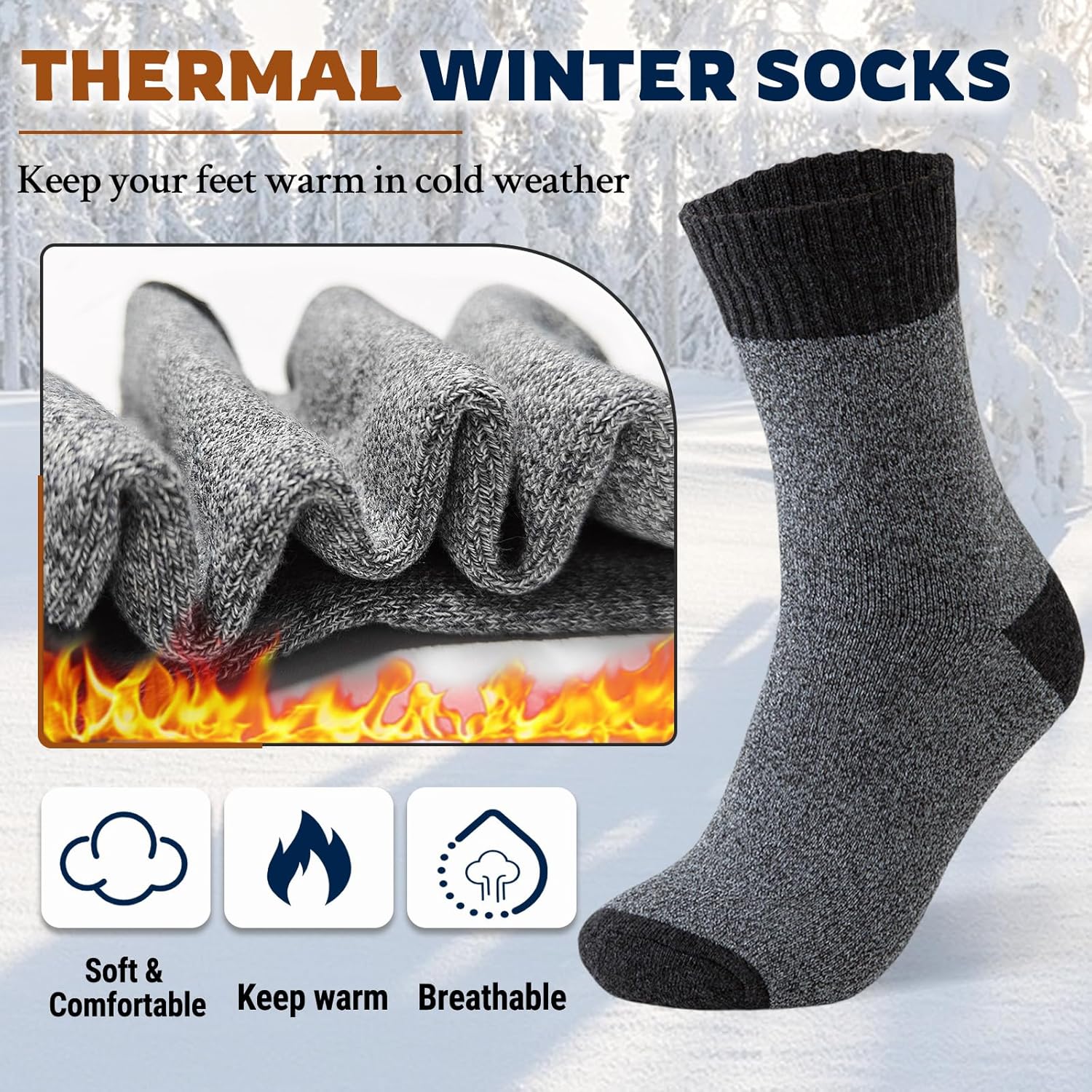 - High-Quality Blended Fabric, Double Warmth And Comfort: These thermal socks for men are crafted from a scientific blend of premium wool and polyester. While retaining wool’s natural warmth, the polyester enhances the fabric’s stretch and durability. The thickened terry design inside can quickly lock in heat, and the thick texture keeps your feet from freezing in the cold winter.