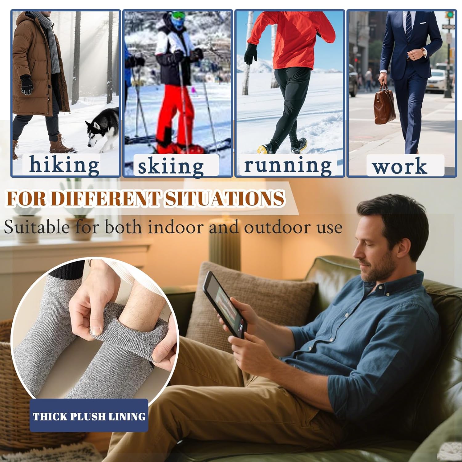 - Ingenious Detail Design, Comfortable and Durable: These men’s thermal socks feature double-layer woven sock cuffs that ensure a snug ankle fit—secure without tightening or slipping. The seamless toe design reduces friction for superior comfort. Additionally, reinforced heel and toe sections significantly improve wear resistance, effectively prevent holes, and extend the thermal socks’ lifespan.