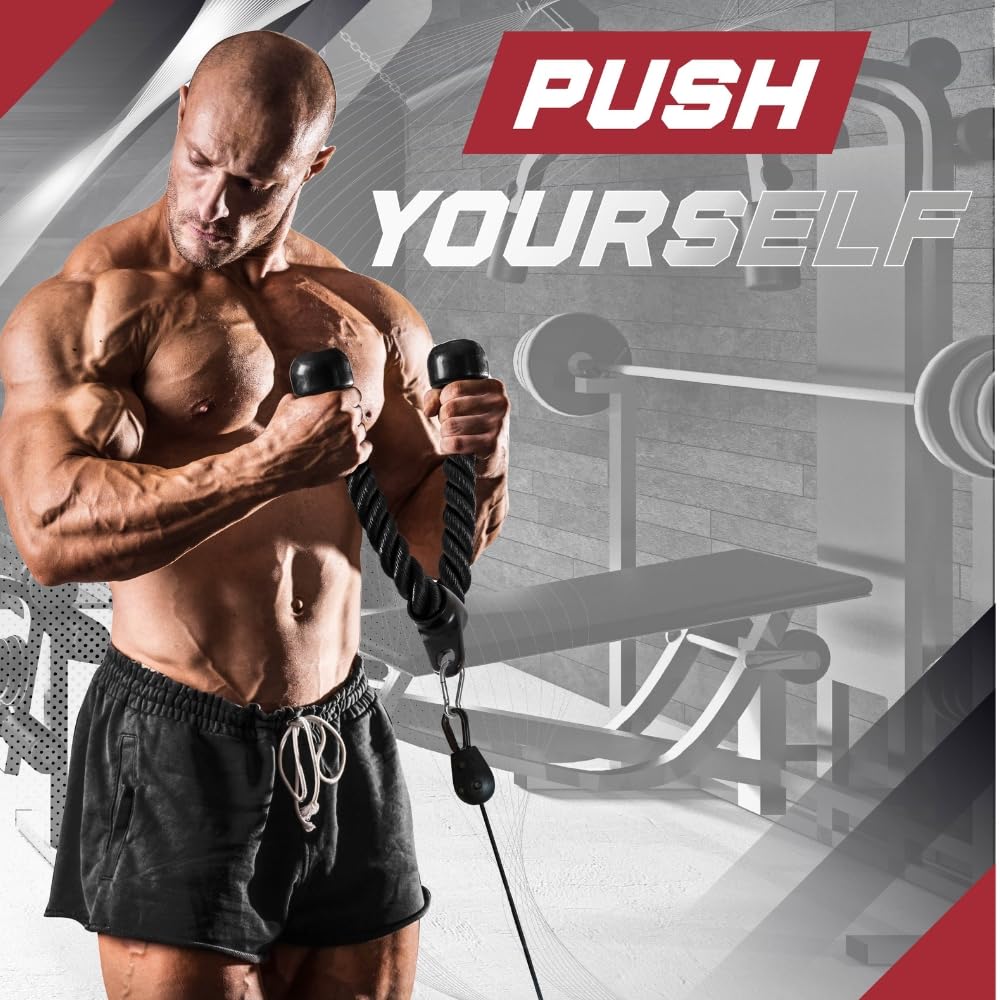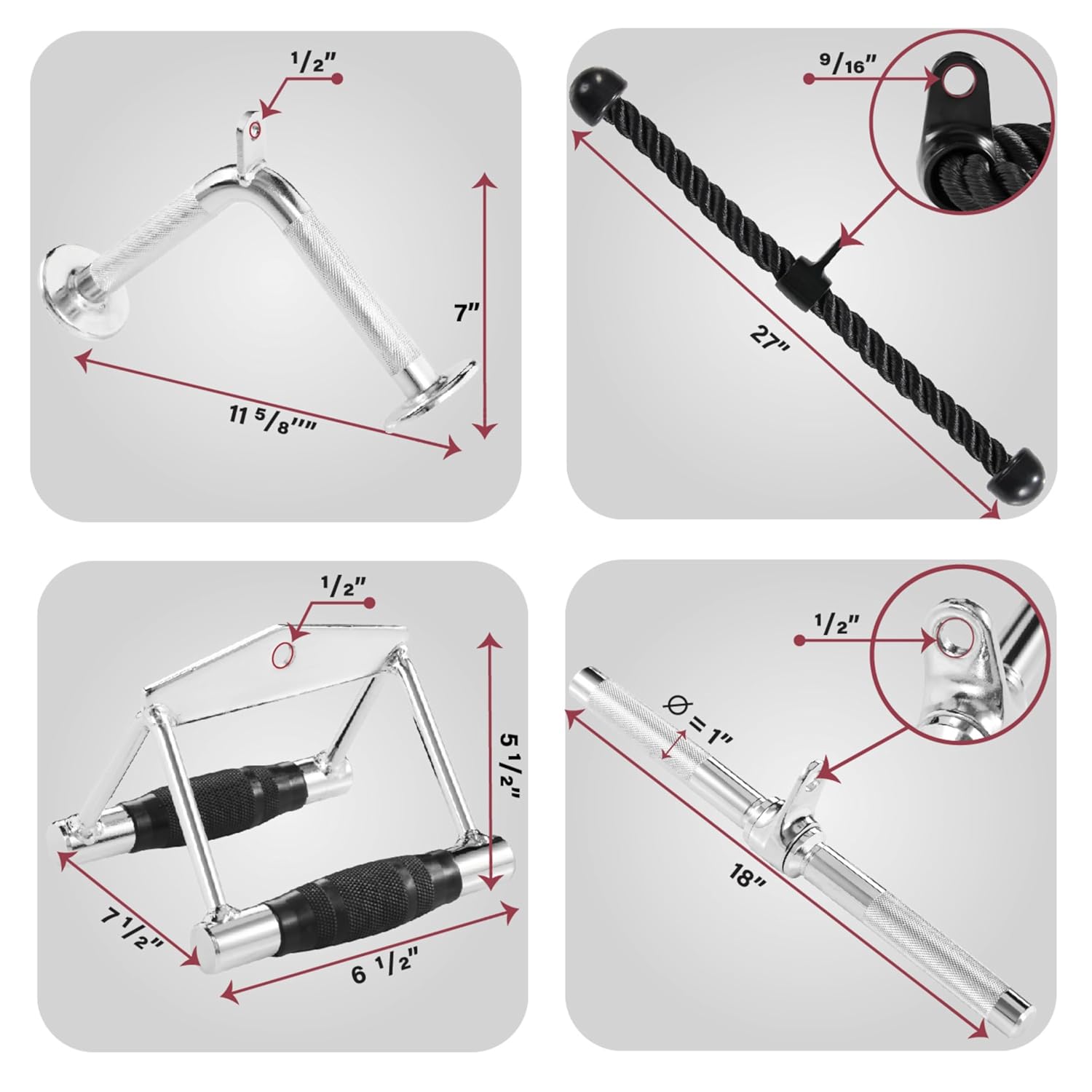 - Maximize Your Workouts: Cable Machine Attachment Set includes a 27″ Tricep rope, Double D Handle with Rubber, Straight bar, and V-shaped bar, allowing you to target multiple muscle groups for a full-body workout.